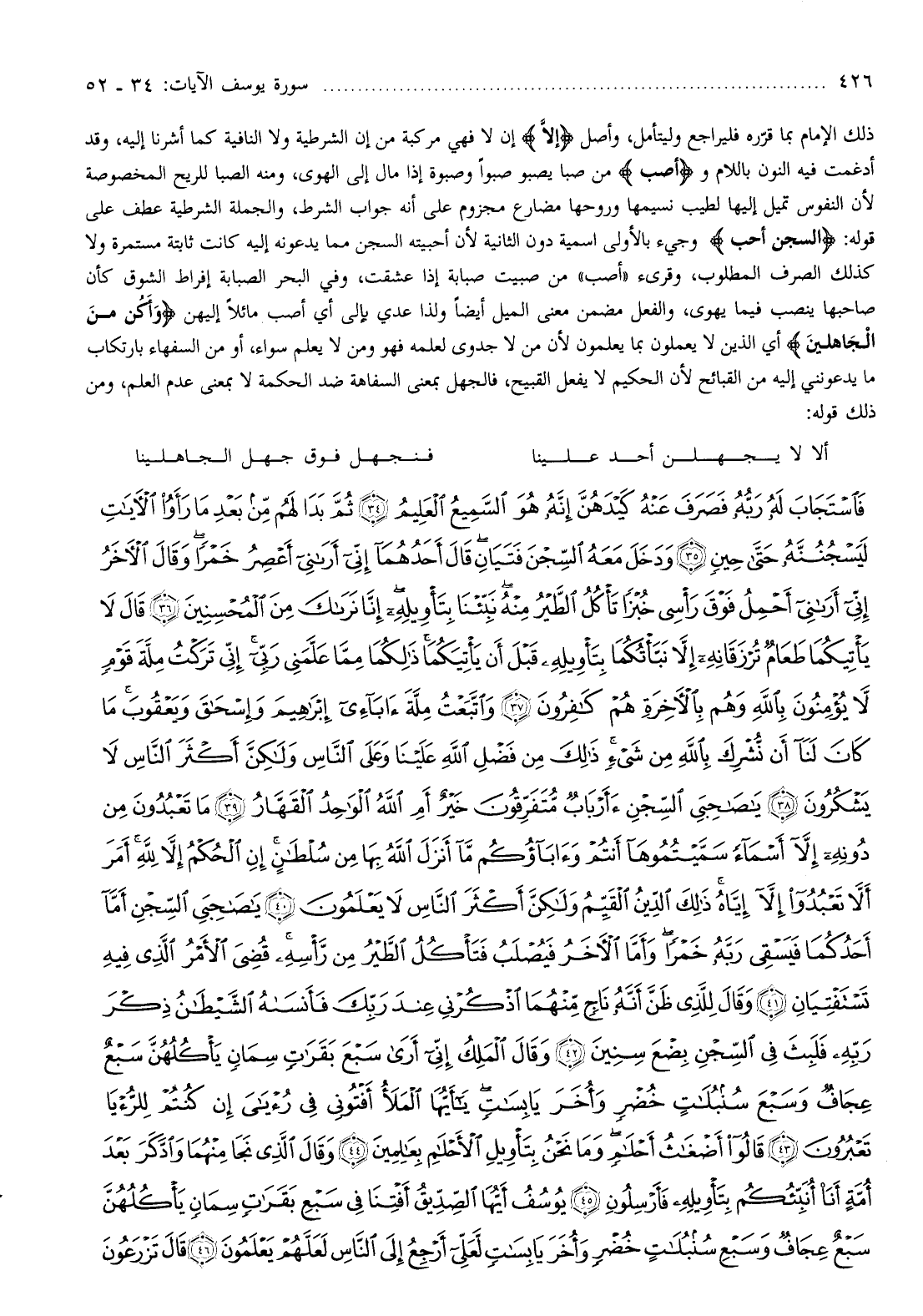 ذلك الإمام بما قرّره فليراجع وليتأمل، وأصل إِلَّا إن لا فهي مركبة من إن الشرطية ولا النافية كما أشرنا إليه، وقد أدغمت فيه النون باللام وأَصْبُ من صبا يصبو صبوا وصبوة إذا مال إلى الهوى، ومنه الصبا للريح المخصوصة لأن النفوس تميل إليها لطيب نسيمها وروحها مضارع مجزوم على أنه جواب الشرط، والجملة الشرطية عطف على قوله: السِّجْنُ أَحَبُّ وجيء بالأولى اسمية دون الثانية لأن أحبيته السجن مما يدعونه إليه كانت ثابتة مستمرة ولا كذلك الصرف المطلوب، وقرىء «أصب» من صبيت صبابة إذا عشقت، وفي البحر الصبابة إفراط الشوق كأن صاحبها ينصب فيما يهوى، والفعل مضمن معنى الميل أيضا ولذا عدي بإلى أي أصب مائلا إليهن وَأَكُنْ مِنَ الْجاهِلِينَ