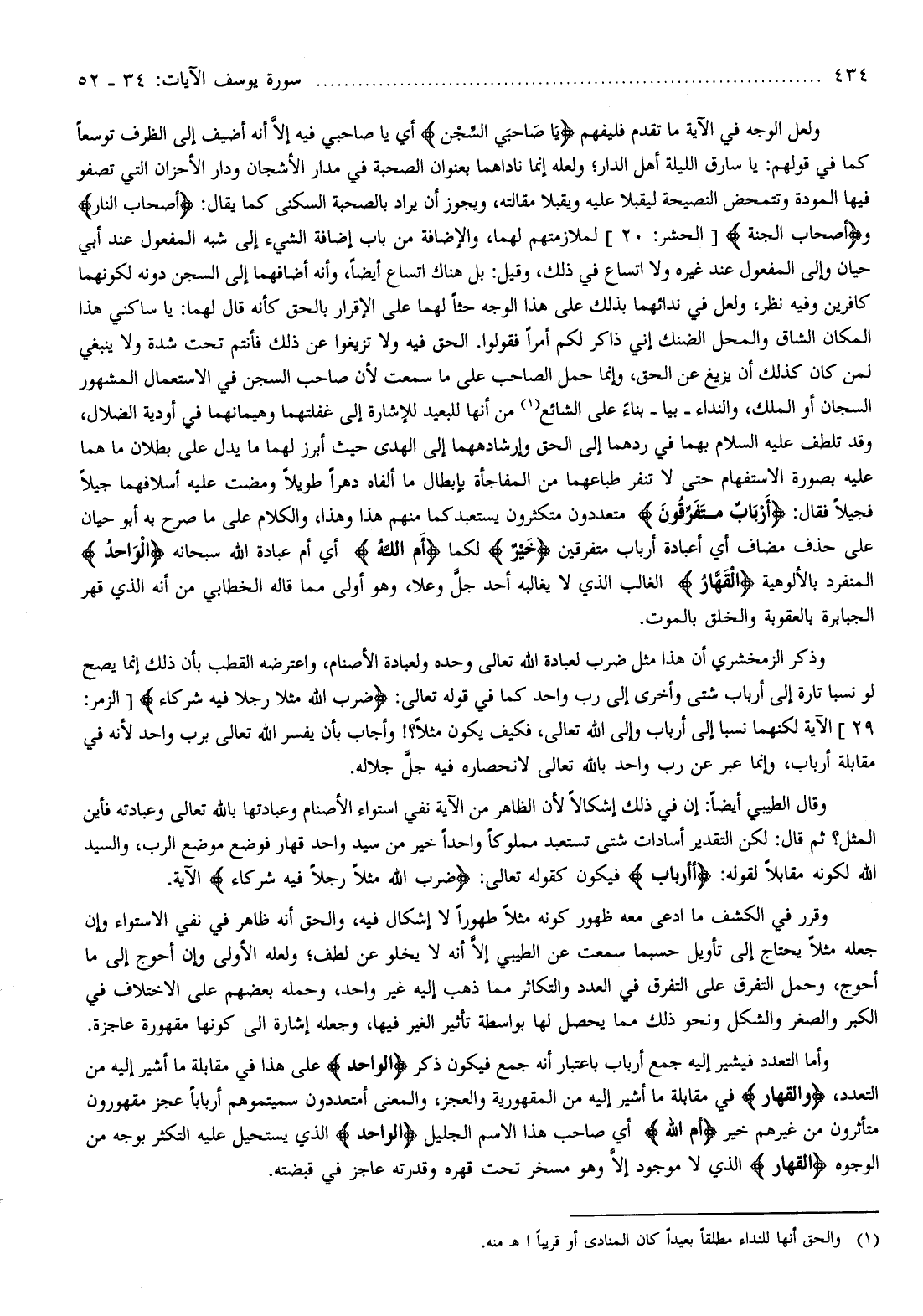 ولعل الوجه في الآية ما تقدم فليفهم يا صاحِبَيِ السِّجْنِ أي يا صاحبي فيه إلّا أنه أضيف إلى الظرف توسعا كما في قولهم: يا سارق الليلة أهل الدار ولعله إنما ناداهما بعنوان الصحبة في مدار الأشجان ودار الأحزان التي تصفو فيها المودة وتتمحض النصيحة ليقبلا عليه ويقبلا مقالته، ويجوز أن يراد بالصحبة السكنى كما يقال: أَصْحابُ النَّارِ وأَصْحابُ الْجَنَّةِ [الحشر: 20] لملازمتهم لهما، والإضافة من باب إضافة الشيء إلى شبه المفعول عند أبي حيان وإلى المفعول عند غيره ولا اتساع في ذلك، وقيل: بل هناك اتساع أيضا، وأنه أضافهما إلى السجن دونه لكونهما كافرين وفيه نظر، ولعل في ندائهما بذلك على هذا الوجه حثا لهما على الإقرار بالحق كأنه قال لهما: يا ساكني هذا المكان الشاق والمحل الضنك إني ذاكر لكم أمرا فقولوا. الحق فيه ولا تزيغوا عن ذلك فأنتم تحت شدة ولا ينبغي لمن كان كذلك أن يزيغ عن الحق، وإنما حمل الصاحب على ما سمعت لأن صاحب السجن في الاستعمال المشهور السجان أو الملك، والنداء- بيا- بناء على الشائع (¬1) من أنها للبعيد للإشارة إلى غفلتهما وهيمانهما في أودية الضلال، وقد تلطف عليه السلام بهما في ردهما إلى الحق وإرشادهما إلى الهدى حيث أبرز لهما ما يدل على بطلان ما هما عليه بصورة الاستفهام حتى لا تنفر طباعهما من المفاجأة بإبطال ما ألفاه دهرا طويلا ومضت عليه أسلافهما جيلا فجيلا فقال: أَرْبابٌ مُتَفَرِّقُونَ متعددون متكثرون يستعبدكما منهم هذا وهذا، والكلام على ما صرح به أبو حيان على حذف مضاف أي أعبادة أرباب متفرقين خَيْرٌ لكما أَمِ اللَّهُ أي أم عبادة الله سبحانه الْواحِدُ المنفرد بالألوهية الْقَهَّارُ الغالب الذي لا يغالبه أحد جلّ وعلا، وهو أولى مما قاله الخطابي من أنه الذي قهر الجبابرة بالعقوبة والخلق بالموت.