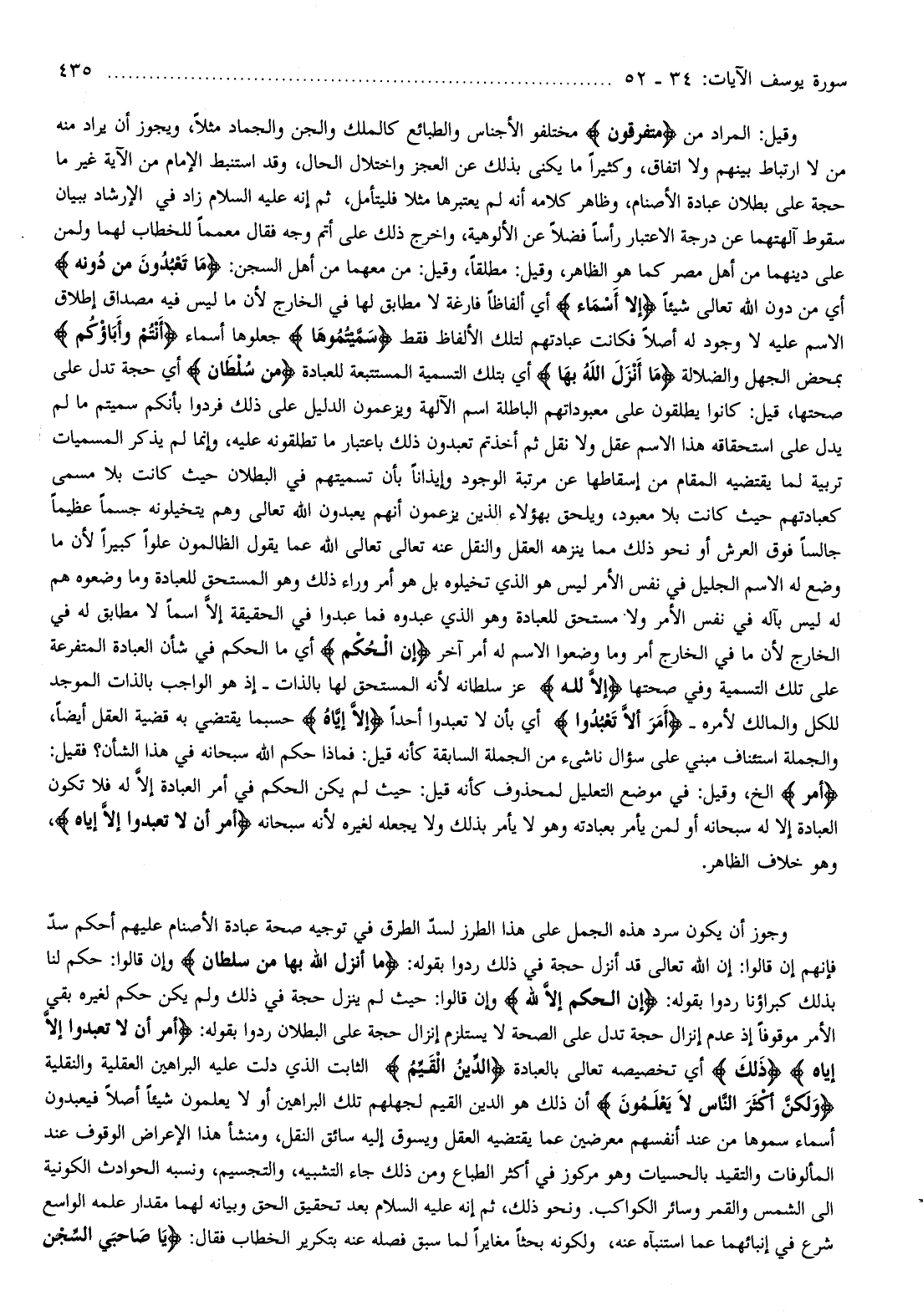 وجوز أن يكون سرد هذه الجمل على هذا الطرز لسدّ الطرق في توجيه صحة عبادة الأصنام عليهم أحكم سدّ فإنهم إن قالوا: إن الله تعالى قد أنزل حجة في ذلك ردوا بقوله: ما أَنْزَلَ اللَّهُ بِها مِنْ سُلْطانٍ وإن قالوا: حكم لنا بذلك كبراؤنا ردوا بقوله: إِنِ الْحُكْمُ إِلَّا لِلَّهِ وإن قالوا: حيث لم ينزل حجة في ذلك ولم يكن حكم لغيره بقي الأمر موقوفا إذ عدم إنزال حجة تدل على الصحة لا يستلزم إنزال حجة على البطلان ردوا بقوله: أَمَرَ أَلَّا تَعْبُدُوا إِلَّا إِيَّاهُ ذلِكَ أي تخصيصه تعالى بالعبادة الدِّينُ الْقَيِّمُ الثابت الذي دلت عليه البراهين العقلية والنقلية وَلكِنَّ أَكْثَرَ النَّاسِ لا يَعْلَمُونَ أن ذلك هو الدين القيم لجهلهم تلك البراهين أو لا يعلمون شيئا أصلا فيعبدون أسماء سموها من عند أنفسهم معرضين عما يقتضيه العقل ويسوق إليه سائق النقل، ومنشأ هذا الإعراض الوقوف عند المألوفات والتقيد بالحسيات وهو مركوز في أكثر الطباع ومن ذلك جاء التشبيه، والتجسيم، ونسبه الحوادث الكونية الى الشمس والقمر وسائر الكواكب. ونحو ذلك، ثم إنه عليه السلام بعد تحقيق الحق وبيانه لهما مقدار علمه الواسع شرع في إنبائهما عما استنبآه عنه، ولكونه بحثا مغايرا لما سبق فصله عنه بتكرير الخطاب فقال: يا صاحِبَيِ السِّجْنِ