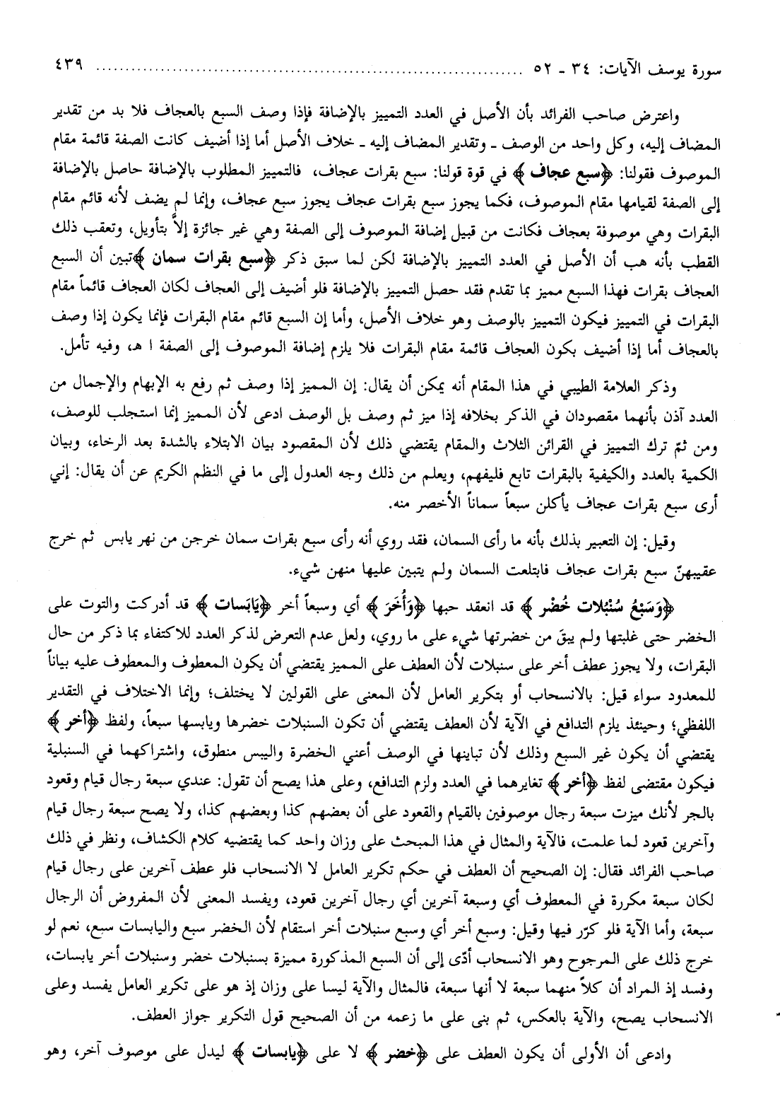 واعترض صاحب الفرائد بأن الأصل في العدد التمييز بالإضافة فإذا وصف السبع بالعجاف فلا بد من تقدير المضاف إليه، وكل واحد من الوصف- وتقدير المضاف إليه- خلاف الأصل أما إذا أضيف كانت الصفة قائمة مقام الموصوف فقولنا: سَبْعٌ عِجافٌ في قوة قولنا: سبع بقرات عجاف، فالتمييز المطلوب بالإضافة حاصل بالإضافة إلى الصفة لقيامها مقام الموصوف، فكما يجوز سبع بقرات عجاف يجوز سبع عجاف، وإنما لم يضف لأنه قائم مقام البقرات وهي موصوفة بعجاف فكانت من قبيل إضافة الموصوف إلى الصفة وهي غير جائزة إلّا بتأويل، وتعقب ذلك القطب بأنه هب أن الأصل في العدد التمييز بالإضافة لكن لما سبق ذكر سَبْعَ بَقَراتٍ سِمانٍ تبين أن السبع العجاف بقرات فهذا السبع مميز بما تقدم فقد حصل التمييز بالإضافة فلو أضيف إلى العجاف لكان العجاف قائما مقام البقرات في التمييز فيكون التمييز بالوصف وهو خلاف الأصل، وأما إن السبع قائم مقام البقرات فإنما يكون إذا وصف بالعجاف أما إذا أضيف بكون العجاف قائمة مقام البقرات فلا يلزم إضافة الموصوف إلى الصفة اهـ، وفيه تأمل.