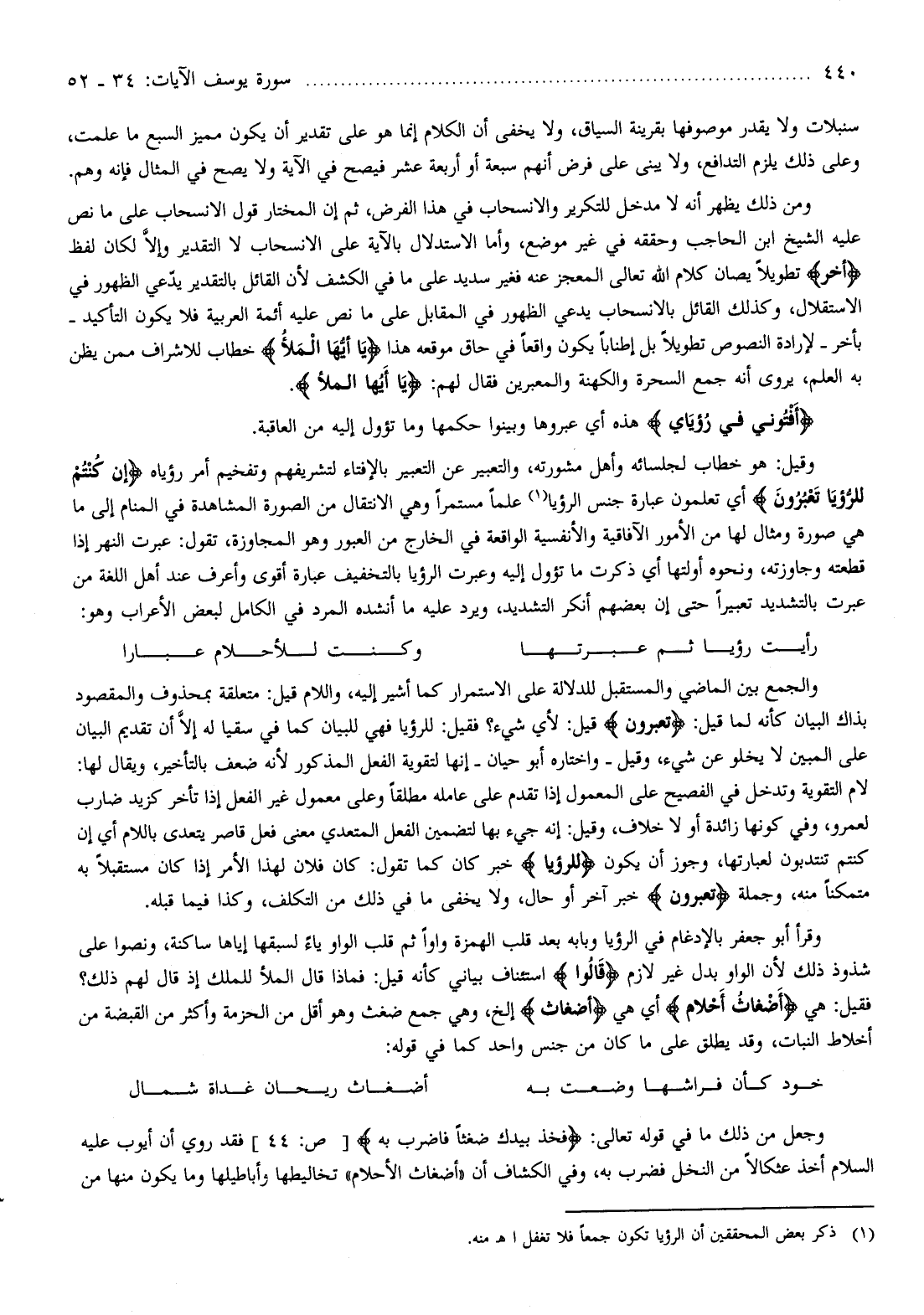 ومن ذلك يظهر أنه لا مدخل للتكرير والانسحاب في هذا الفرض، ثم إن المختار قول الانسحاب على ما نص عليه الشيخ ابن الحاجب وحققه في غير موضع، وأما الاستدلال بالآية على الانسحاب لا التقدير وإلّا لكان لفظ أُخَرَ تطويلا يصان كلام الله تعالى المعجز عنه فغير سديد على ما في الكشف لأن القائل بالتقدير يدّعي الظهور في الاستقلال، وكذلك القائل بالانسحاب يدعي الظهور في المقابل على ما نص عليه أئمة العربية فلا يكون التأكيد- بأخر- لإرادة النصوص تطويلا بل إطنابا يكون واقعا في حاق موقعه هذا يا أَيُّهَا الْمَلَأُ خطاب للاشراف ممن يظن به العلم، يروى أنه جمع السحرة والكهنة والمعبرين فقال لهم: يا أَيُّهَا الْمَلَأُ.