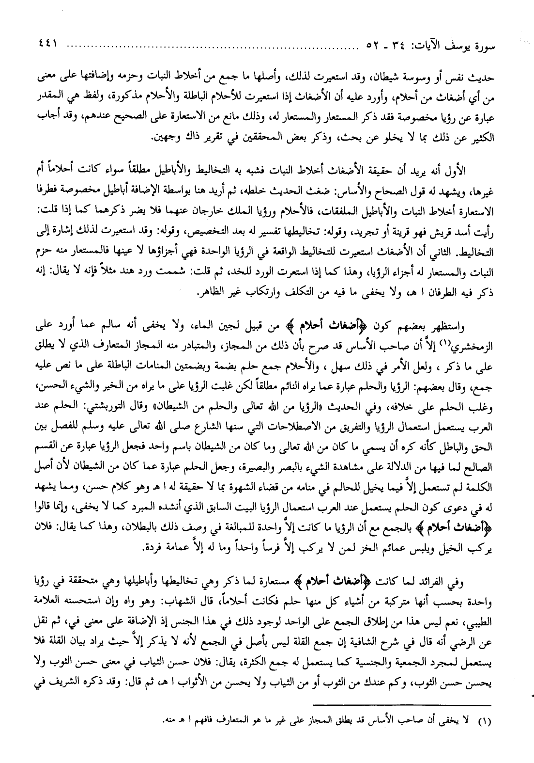 الأول أنه يريد أن حقيقة الأضغاث أخلاط النبات فشبه به التخاليط والأباطيل مطلقا سواء كانت أحلاما أم غيرها، ويشهد له قول الصحاح والأساس: ضغث الحديث خلطه، ثم أريد هنا بواسطة الإضافة أباطيل مخصوصة فطرفا الاستعارة أخلاط النبات والأباطيل الملفقات، فالأحلام ورؤيا الملك خارجان عنهما فلا يضر ذكرهما كما إذا قلت: