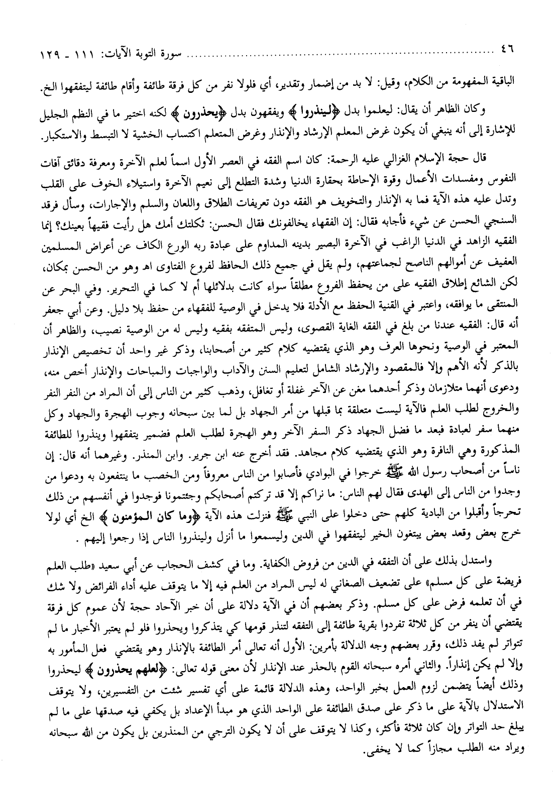 قال حجة الإسلام الغزالي عليه الرحمة: كان اسم الفقه في العصر الأول اسما لعلم الآخرة ومعرفة دقائق آفات النفوس ومفسدات الأعمال وقوة الإحاطة بحقارة الدنيا وشدة التطلع إلى نعيم الآخرة واستيلاء الخوف على القلب وتدل عليه هذه الآية فما به الإنذار والتخويف هو الفقه دون تعريفات الطلاق واللعان والسلم والإجارات، وسأل فرقد السنجي الحسن عن شيء فأجابه فقال: إن الفقهاء يخالفونك فقال الحسن: ثكلتك أمك هل رأيت فقيها بعينك؟ إنما الفقيه الزاهد في الدنيا الراغب في الآخرة البصير بدينه المداوم على عبادة ربه الورع الكاف عن أعراض المسلمين العفيف عن أموالهم الناصح لجماعتهم، ولم يقل في جميع ذلك الحافظ لفروع الفتاوى اه وهو من الحسن بمكان، لكن الشائع إطلاق الفقيه على من يحفظ الفروع مطلقا سواء كانت بدلائلها أم لا كما في التحرير. وفي البحر عن المنتقى ما يوافقه، واعتبر في القنية الحفظ مع الأدلة فلا يدخل في الوصية للفقهاء من حفظ بلا دليل. وعن أبي جعفر أنه قال: الفقيه عندنا من بلغ في الفقه الغاية القصوى، وليس المتفقه بفقيه وليس له من الوصية نصيب، والظاهر أن المعتبر في الوصية ونحوها العرف وهو الذي يقتضيه كلام كثير من أصحابنا، وذكر غير واحد أن تخصيص الإنذار بالذكر لأنه الأهم وإلا فالمقصود والإرشاد الشامل لتعليم السنن والآداب والواجبات والمباحات والإنذار أخص منه، ودعوى أنهما متلازمان وذكر أحدهما مغن عن الآخر غفلة أو تغافل، وذهب كثير من الناس إلى أن المراد من النفر النفر والخروج لطلب العلم فالآية ليست متعلقة بما قبلها من أمر الجهاد بل لما بين سبحانه وجوب الهجرة والجهاد وكل منهما سفر لعبادة فبعد ما فضل الجهاد ذكر السفر الآخر وهو الهجرة لطلب العلم فضمير يتفقهوا وينذروا للطائفة المذكورة وهي النافرة وهو الذي يقتضيه كلام مجاهد. فقد أخرج عنه ابن جرير. وابن المنذر. وغيرهما أنه قال: إن ناسا من أصحاب رسول الله صلّى الله عليه وسلم خرجوا في البوادي فأصابوا من الناس معروفا ومن الخصب ما ينتفعون به ودعوا من وجدوا من الناس إلى الهدى فقال لهم الناس: ما نراكم إلا قد تركتم أصحابكم وجئتمونا فوجدوا في أنفسهم من ذلك تحرجا وأقبلوا من البادية كلهم حتى دخلوا على النبي صلّى الله عليه وسلم فنزلت هذه الآية وَما كانَ الْمُؤْمِنُونَ إلخ أي لولا خرج بعض وقعد بعض يبتغون الخير ليتفقهوا في الدين وليسمعوا ما أنزل ولينذروا الناس إذا رجعوا إليهم.