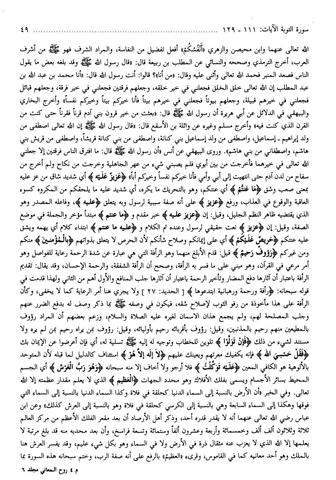 عَزِيزٌ عَلَيْهِ أي شديد شاق من عز عليه بمعنى صعب وشق ما عَنِتُّمْ أي عنتكم، وهو بالتحريك ما يكره، أي شديد عليه ما يلحقكم من المكروه كسوء العاقبة والوقوع في العذاب، ورفع عَزِيزٌ على أنه صفة سببية لرسول وبه يتعلق عَلَيْهِ، وفاعله المصدر وهو الذي يقتضيه ظاهر النظم الجليل، وقيل: إن عَزِيزٌ عَلَيْهِ خبر مقدم وما عَنِتُّمْ مبتدأ مؤخر والجملة في موضع الصفة، وقيل: إن عَزِيزٌ نعت حقيقي لرسول وعنده تم الكلام وعَلَيْهِ ما عَنِتُّمْ ابتداء كلام أي يهمه ويشق عليه عنتكم حَرِيصٌ عَلَيْكُمْ أي على إيمانكم وصلاح شأنكم لأن الحرص لا يتعلق بذواتهم بِالْمُؤْمِنِينَ منكم ومن غيركم رَؤُفٌ رَحِيمٌ قيل: قدم الأبلغ منهما وهو الرأفة التي هي عبارة عن شدة الرحمة رعاية للفواصل وهو أمر مرعي في القرآن، وهو مبني على ما فسر به الرأفة، وصحح أن الرأفة الشفقة، والرحمة الإحسان، وقد يقال: تقديم الرأفة باعتبار أن آثارها دفع المضار وتأخير الرحمة باعتبار أن آثارها جلب المنافع والأول أهم من الثاني ولهذا قدمت في قوله سبحانه: رَأْفَةً وَرَحْمَةً وَرَهْبانِيَّةً ابْتَدَعُوها [الحديد: 27] ولا يجري هنا أمر الرعاية كما لا يخفى، وكأن الرأفة على هذا مأخوذة من رفو الثوب لإصلاح شقه، فيكون في وصفه صلّى الله عليه وسلم بما ذكر وصف له بدفع الضرر عنهم وجلب المصلحة لهم، ولم يجمع هذان الاسمان لغيره عليه الصلاة والسلام، وزعم بعضهم أن المراد رؤوف بالمطيعين منهم رحيم بالمذنبين، وقيل: رؤوف بأقربائه رحيم بأوليائه، وقيل: رؤوف بمن يراه رحيم بمن لم يره ولا مستند لشيء من ذلك فَإِنْ تَوَلَّوْا تلوين للخطاب وتوجيه له إليه صلّى الله عليه وسلم تسلية له، أي فإن أعرضوا عن الإيمان بك فَقُلْ حَسْبِيَ اللَّهُ فإنه يكفيك معرتهم ويعينك عليهم لا إِلهَ إِلَّا هُوَ استئناف كالدليل لما قبله لأن المتوحد بالألوهية هو الكافي المعين عَلَيْهِ تَوَكَّلْتُ فلا أرجو ولا أخاف إلا منه سبحانه وَهُوَ رَبُّ الْعَرْشِ أي الجسم المحيط بسائر الأجسام ويسمى بفلك الأفلاك وهو محدد الجهات الْعَظِيمِ الذي لا يعلم مقدار عظمته إلا الله تعالى.
