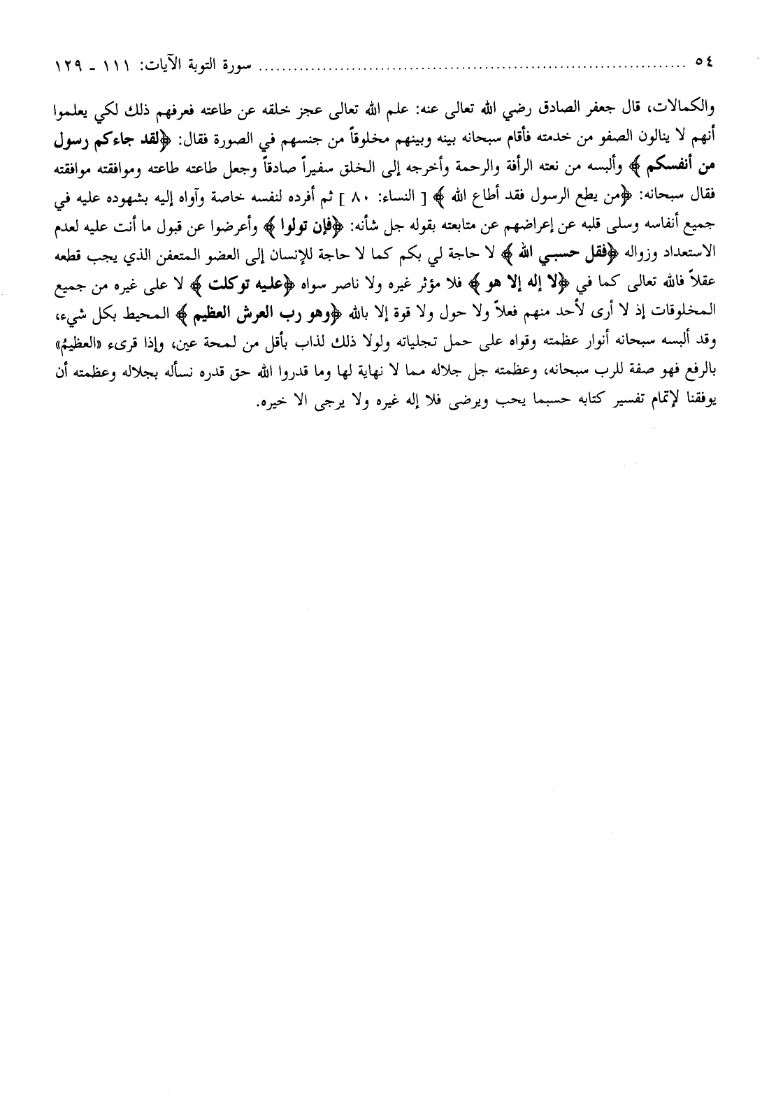 قال جعفر الصادق رضي الله تعالى عنه: علم الله تعالى عجز خلقه عن طاعته فعرفهم ذلك لكي يعلموا أنهم لا ينالون الصفو من خدمته فأقام سبحانه بينه وبينهم مخلوقا من جنسهم في الصورة فقال: لَقَدْ جاءَكُمْ رَسُولٌ مِنْ أَنْفُسِكُمْ وألبسه من نعته الرأفة والرحمة وأخرجه إلى الخلق سفيرا صادقا وجعل طاعته طاعته وموافقته موافقته فقال سبحانه: مَنْ يُطِعِ الرَّسُولَ فَقَدْ أَطاعَ اللَّهَ