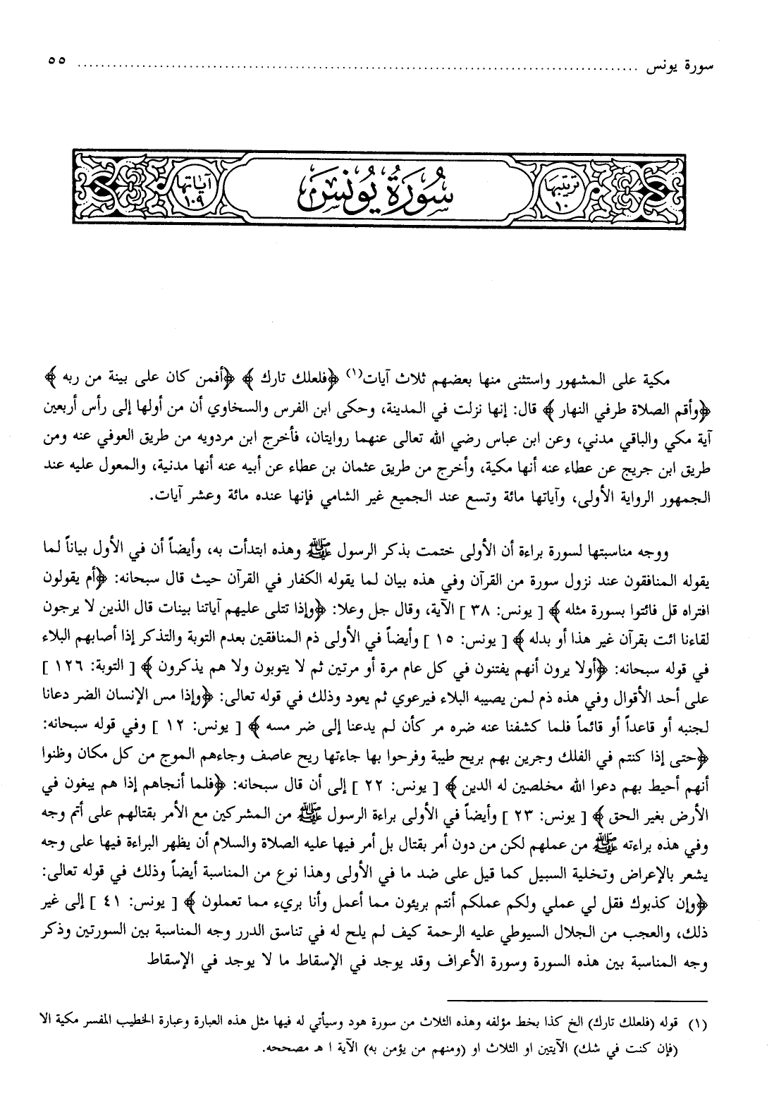 ووجه مناسبتها لسورة براءة أن الأولى ختمت بذكر الرسول صلّى الله عليه وسلم وهذه ابتدأت به، وأيضا أن في الأول بيانا لما يقوله المنافقون عند نزول سورة من القرآن وفي هذه بيان لما يقوله الكفار في القرآن حيث قال سبحانه: أَمْ يَقُولُونَ افْتَراهُ قُلْ فَأْتُوا بِسُورَةٍ مِثْلِهِ [يونس: 38] الآية، وقال جل وعلا: وَإِذا تُتْلى عَلَيْهِمْ آياتُنا بَيِّناتٍ قالَ الَّذِينَ لا يَرْجُونَ لِقاءَنَا ائْتِ بِقُرْآنٍ غَيْرِ هذا أَوْ بَدِّلْهُ [يونس: 15] وأيضا في الأولى ذم المنافقين بعدم التوبة والتذكر إذا أصابهم البلاء في قوله سبحانه: أَوَلا يَرَوْنَ أَنَّهُمْ يُفْتَنُونَ فِي كُلِّ عامٍ مَرَّةً أَوْ مَرَّتَيْنِ ثُمَّ لا يَتُوبُونَ وَلا هُمْ يَذَّكَّرُونَ [التوبة: 126] على أحد الأقوال وفي هذه ذم لمن يصيبه البلاء فيرعوي ثم يعود وذلك في قوله تعالى: وَإِذا مَسَّ الْإِنْسانَ الضُّرُّ دَعانا لِجَنْبِهِ أَوْ قاعِداً أَوْ قائِماً فَلَمَّا كَشَفْنا عَنْهُ ضُرَّهُ مَرَّ كَأَنْ لَمْ يَدْعُنا إِلى ضُرٍّ مَسَّهُ [يونس: 12] وفي قوله سبحانه: