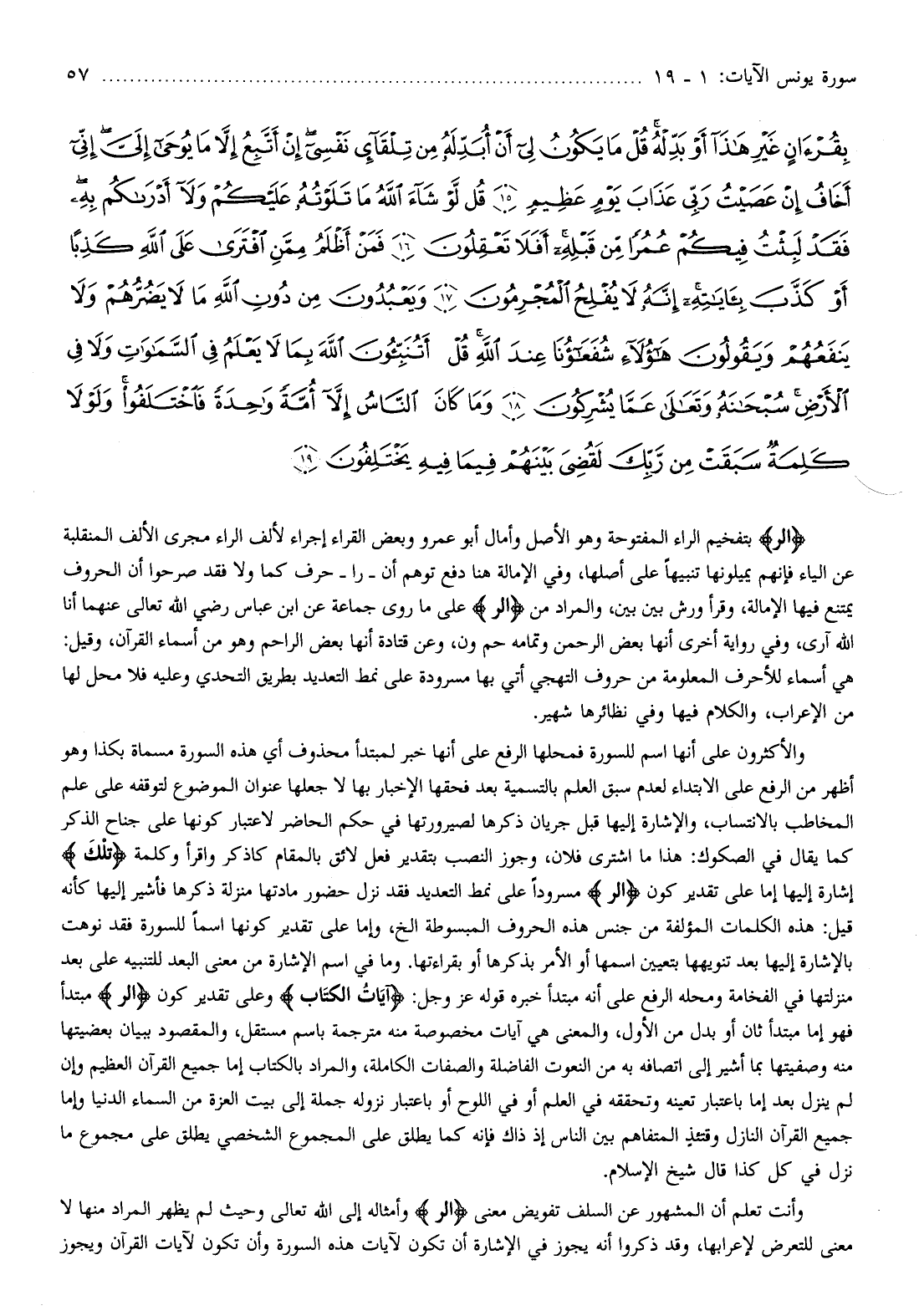 وأنت تعلم أن المشهور عن السلف تفويض معنى الر وأمثاله إلى الله تعالى وحيث لم يظهر المراد منها لا معنى للتعرض لإعرابها، وقد ذكروا أنه يجوز في الإشارة أن تكون لآيات هذه السورة وأن تكون لآيات القرآن ويجوز