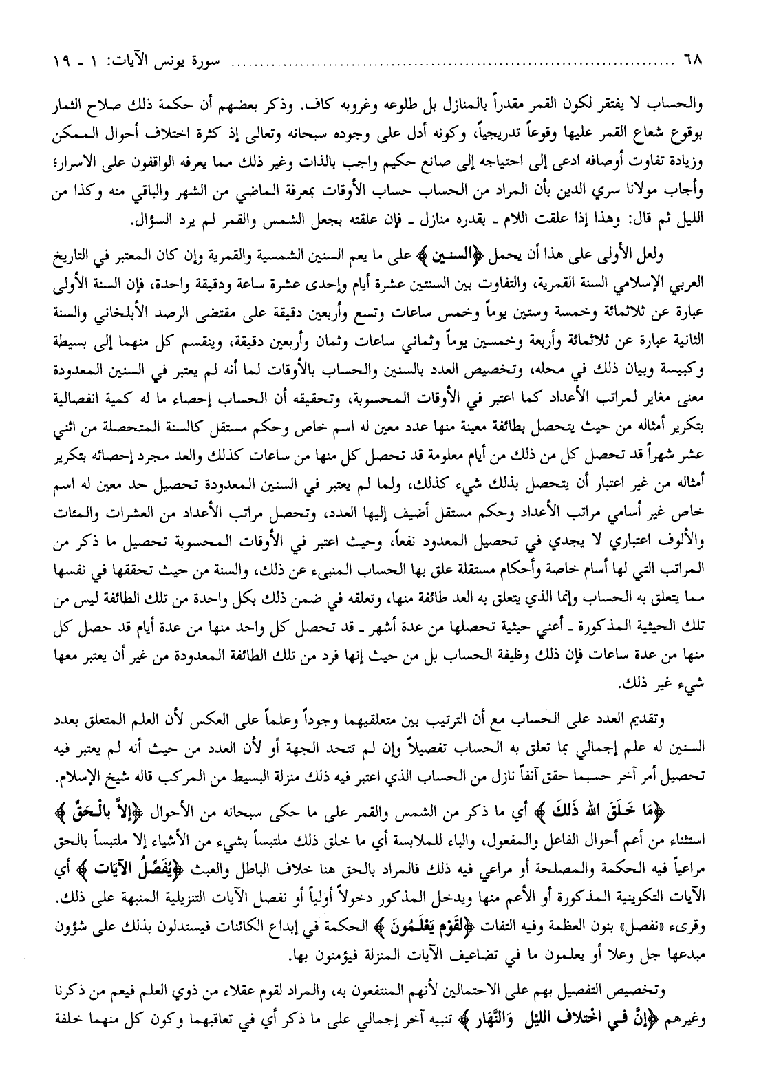 ولعل الأولى على هذا أن يحمل السِّنِينَ على ما يعم السنين الشمسية والقمرية وإن كان المعتبر في التاريخ العربي الإسلامي السنة القمرية، والتفاوت بين السنتين عشرة أيام وإحدى عشرة ساعة ودقيقة واحدة، فإن السنة الأولى عبارة عن ثلاثمائة وخمسة وستين يوما وخمس ساعات وتسع وأربعين دقيقة على مقتضى الرصد الأبلخاني والسنة الثانية عبارة عن ثلاثمائة وأربعة وخمسين يوما وثماني ساعات وثمان وأربعين دقيقة، وينقسم كل منهما إلى بسيطة وكبيسة وبيان ذلك في محله، وتخصيص العدد بالسنين والحساب بالأوقات لما أنه لم يعتبر في السنين المعدودة معنى مغاير لمراتب الأعداد كما اعتبر في الأوقات المحسوبة، وتحقيقه أن الحساب إحصاء ما له كمية انفصالية بتكرير أمثاله من حيث يتحصل بطائفة معينة منها عدد معين له اسم خاص وحكم مستقل كالسنة المتحصلة من اثني عشر شهرا قد تحصل كل من ذلك من أيام معلومة قد تحصل كل منها من ساعات كذلك والعد مجرد إحصائه بتكرير أمثاله من غير اعتبار أن يتحصل بذلك شيء كذلك، ولما لم يعتبر في السنين المعدودة تحصيل حد معين له اسم خاص غير أسامي مراتب الأعداد وحكم مستقل أضيف إليها العدد، وتحصل مراتب الأعداد من العشرات والمئات والألوف اعتباري لا يجدي في تحصيل المعدود نفعا، وحيث اعتبر في الأوقات المحسوبة تحصيل ما ذكر من المراتب التي لها أسام خاصة وأحكام مستقلة علق بها الحساب المنبئ عن ذلك، والسنة من حيث تحققها في نفسها مما يتعلق به الحساب وإنما الذي يتعلق به العد طائفة منها، وتعلقه في ضمن ذلك بكل واحدة من تلك الطائفة ليس من تلك الحيثية المذكورة- أعني حيثية تحصلها من عدة أشهر- قد تحصل كل واحد منها من عدة أيام قد حصل كل منها من عدة ساعات فإن ذلك وظيفة الحساب بل من حيث إنها فرد من تلك الطائفة المعدودة من غير أن يعتبر معها شيء غير ذلك.