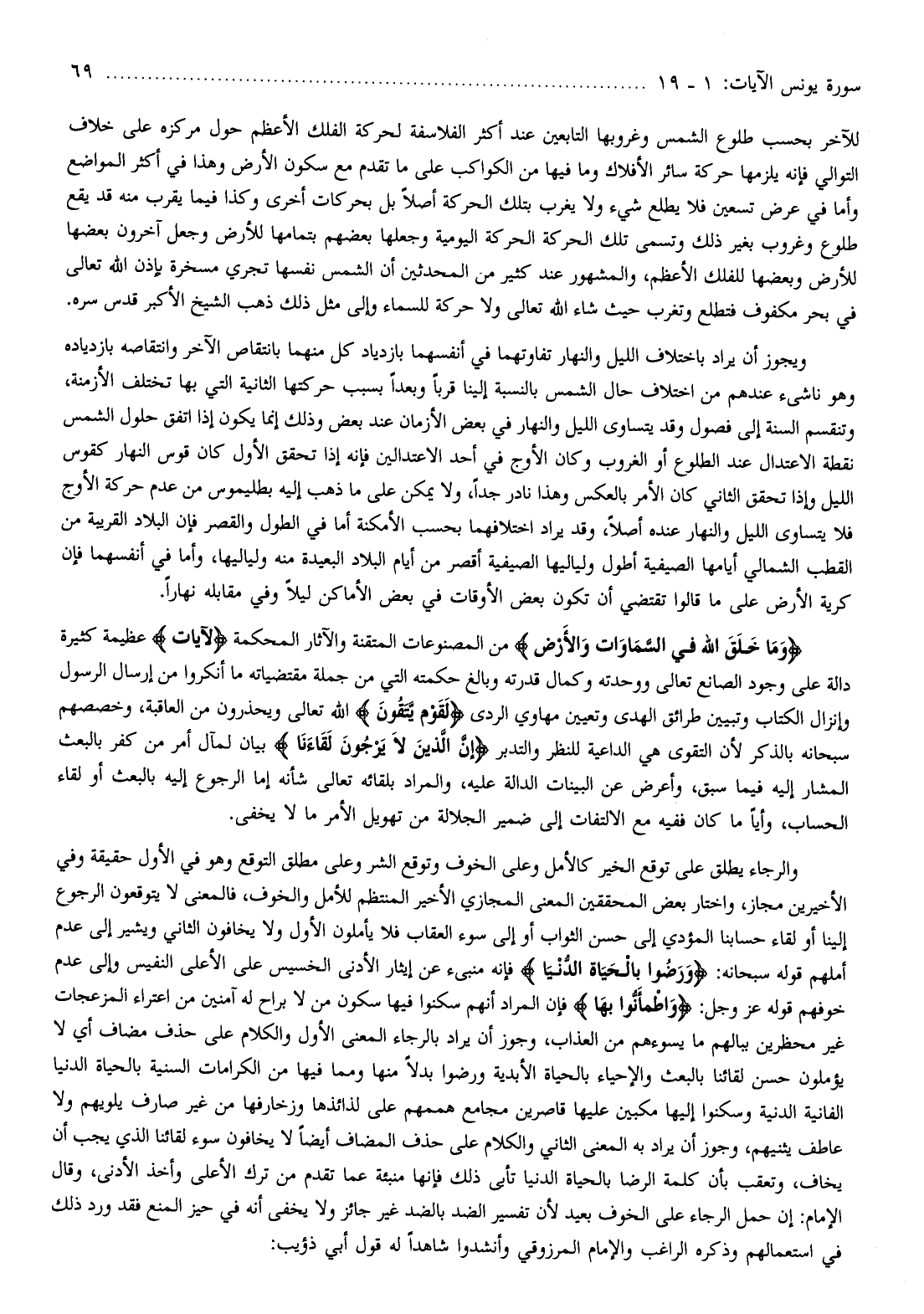 والرجاء يطلق على توقع الخير كالأمل وعلى الخوف وتوقع الشر وعلى مطلق التوقع وهو في الأول حقيقة وفي الأخيرين مجاز، واختار بعض المحققين المعنى المجازي الأخير المنتظم للأمل والخوف، فالمعنى لا يتوقعون الرجوع إلينا أو لقاء حسابنا المؤدي إلى حسن الثواب أو إلى سوء العقاب فلا يأملون الأول ولا يخافون الثاني ويشير إلى عدم أملهم قوله سبحانه: وَرَضُوا بِالْحَياةِ الدُّنْيا فإنه منبىء عن إيثار الأدنى الخسيس على الأعلى النفيس وإلى عدم خوفهم قوله عز وجل: وَاطْمَأَنُّوا بِها فإن المراد أنهم سكنوا فيها سكون من لا براح له آمنين من اعتراء المزعجات غير محظرين ببالهم ما يسوءهم من العذاب، وجوز أن يراد بالرجاء المعنى الأول والكلام على حذف مضاف أي لا يؤملون حسن لقائنا بالبعث والإحياء بالحياة الأبدية ورضوا بدلا منها ومما فيها من الكرامات السنية بالحياة الدنيا الفانية الدنية وسكنوا إليها مكبين عليها قاصرين مجامع هممهم على لذائذها وزخارفها من غير صارف يلويهم ولا عاطف يثنيهم، وجوز أن يراد به المعنى الثاني والكلام على حذف المضاف أيضا لا يخافون سوء لقائنا الذي يجب أن يخاف، وتعقب بأن كلمة الرضا بالحياة الدنيا تأبى ذلك فإنها منبئة عما تقدم من ترك الأعلى وأخذ الأدنى، وقال الإمام: إن حمل الرجاء على الخوف بعيد لأن تفسير الضد بالضد غير جائز ولا يخفى أنه في حيز المنع فقد ورد ذلك في استعمالهم وذكره الراغب والإمام المرزوقي وأنشدوا شاهدا له قول أبي ذؤيب: