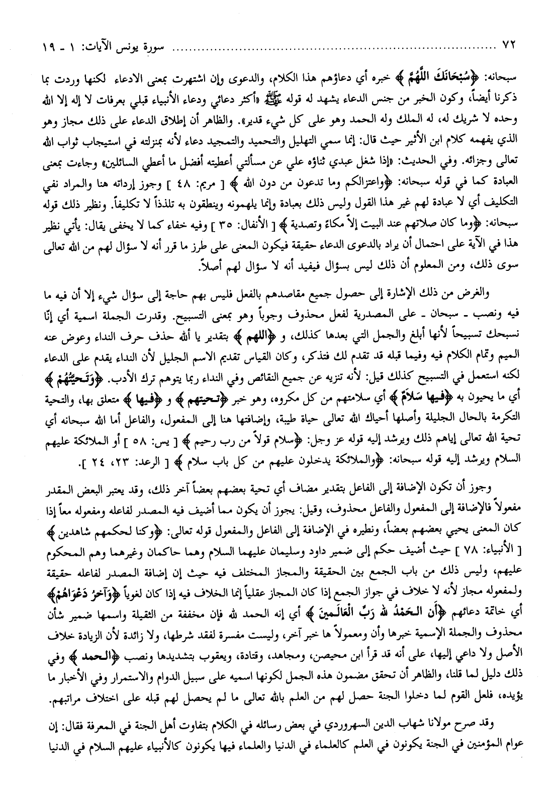والغرض من ذلك الإشارة إلى حصول جميع مقاصدهم بالفعل فليس بهم حاجة إلى سؤال شيء إلا أن فيه ما فيه ونصب- سبحان- على المصدرية لفعل محذوف وجوبا وهو بمعنى التسبيح. وقدرت الجملة اسمية أي إنّا نسبحك تسبيحا لأنها أبلغ والجمل التي بعدها كذلك، واللَّهُمَّ بتقدير يا الله حذف حرف النداء وعوض عنه الميم وتمام الكلام فيه وفيما قبله قد تقدم لك فتذكر، وكان القياس تقديم الاسم الجليل لأن النداء يقدم على الدعاء لكنه استعمل في التسبيح كذلك قيل: لأنه تنزيه عن جميع النقائص وفي النداء ربما يتوهم ترك الأدب. وَتَحِيَّتُهُمْ أي ما يحيون به فِيها سَلامٌ أي سلامتهم من كل مكروه، وهو خبر تَحِيَّتُهُمْ وفِيها متعلق بها، والتحية التكرمة بالحال الجليلة وأصلها أحياك الله تعالى حياة طيبة، وإضافتها هنا إلى المفعول، والفاعل أما الله سبحانه أي تحية الله تعالى إياهم ذلك ويرشد إليه قوله عز وجل: سَلامٌ قَوْلًا مِنْ رَبٍّ رَحِيمٍ [يس: 58] أو الملائكة عليهم السلام ويرشد إليه قوله سبحانه: وَالْمَلائِكَةُ يَدْخُلُونَ عَلَيْهِمْ مِنْ كُلِّ بابٍ سَلامٌ [الرعد: 23، 24] .