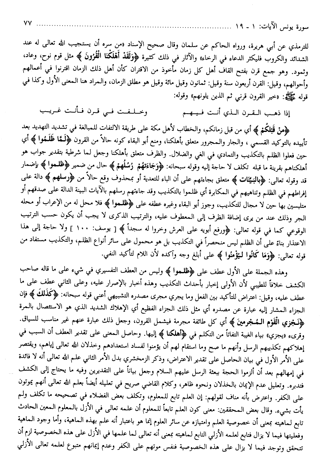 والآثار في ذلك كثيرة وَلَقَدْ أَهْلَكْنَا الْقُرُونَ مثل قوم نوح، وعاد، وثمود. وهو جمع قرن بفتح القاف أهل كل زمان مأخوذ من الاقتران كأن أهل ذلك الزمان اقترنوا في أعمالهم وأحوالهم، وقيل: القرن أربعون سنة وقيل: ثمانون وقيل مائة وقيل هو مطلق الزمان، والمراد هنا المعنى الأول وكذا في