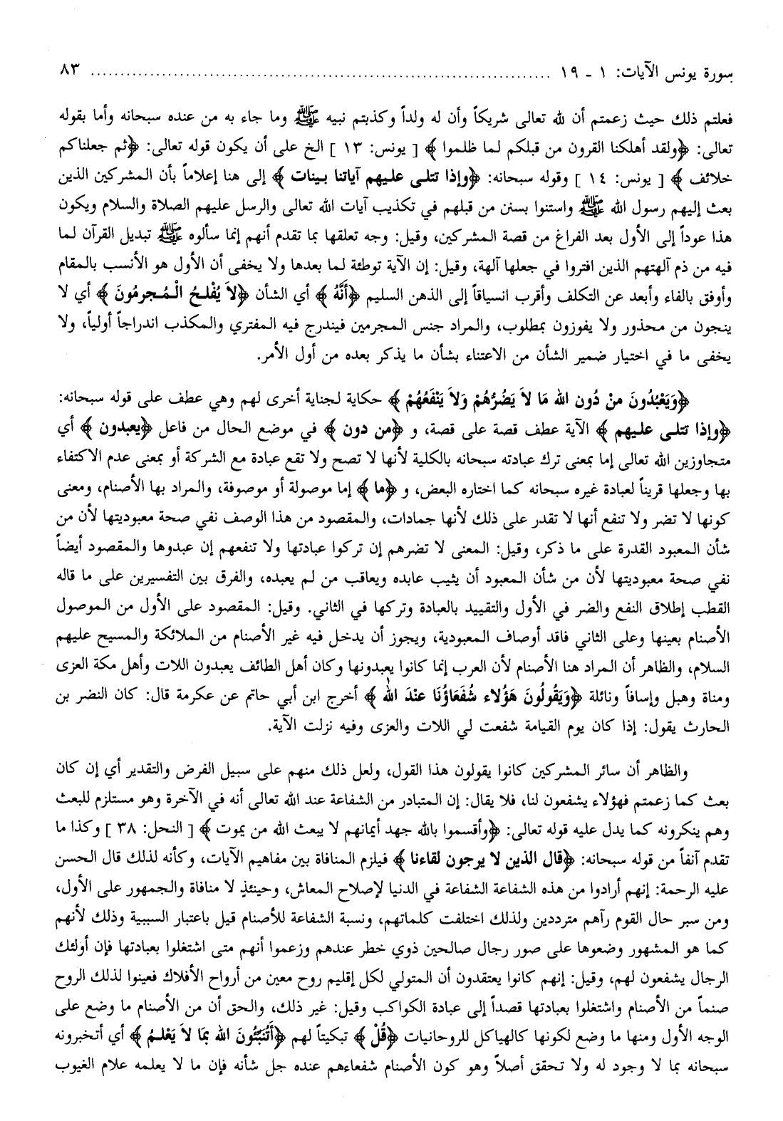 وَإِذا تُتْلى عَلَيْهِمْ الآية عطف قصة على قصة، ومِنْ دُونِ في موضع الحال من فاعل يَعْبُدُونَ أي متجاوزين الله تعالى إما بمعنى ترك عبادته سبحانه بالكلية لأنها لا تصح ولا تقع عبادة مع الشركة أو بمعنى عدم الاكتفاء بها وجعلها قرينا لعبادة غيره سبحانه كما اختاره البعض، وما إما موصولة أو موصوفة، والمراد بها الأصنام، ومعنى كونها لا تضر ولا تنفع أنها لا تقدر على ذلك لأنها جمادات، والمقصود من هذا الوصف نفي صحة معبوديتها لأن من شأن المعبود القدرة على ما ذكر، وقيل: المعنى لا تضرهم إن تركوا عبادتها ولا تنفعهم إن عبدوها والمقصود أيضا نفي صحة معبوديتها لأن من شأن المعبود أن يثيب عابده ويعاقب من لم يعبده، والفرق بين التفسيرين على ما قاله القطب إطلاق النفع والضر في الأول والتقييد بالعبادة وتركها في الثاني. وقيل: المقصود على الأول من الموصول الأصنام بعينها وعلى الثاني فاقد أوصاف المعبودية، ويجوز أن يدخل فيه غير الأصنام من الملائكة والمسيح عليهم السلام، والظاهر أن المراد هنا الأصنام لأن العرب إنما كانوا يعبدونها وكان أهل الطائف يعبدون اللات وأهل مكة العزى ومناة وهبل وإسافا ونائلة وَيَقُولُونَ هؤُلاءِ شُفَعاؤُنا عِنْدَ اللَّهِ أخرج ابن أبي حاتم عن عكرمة قال: كان النضر بن الحارث يقول: إذا كان يوم القيامة شفعت لي اللات والعزى وفيه نزلت الآية.