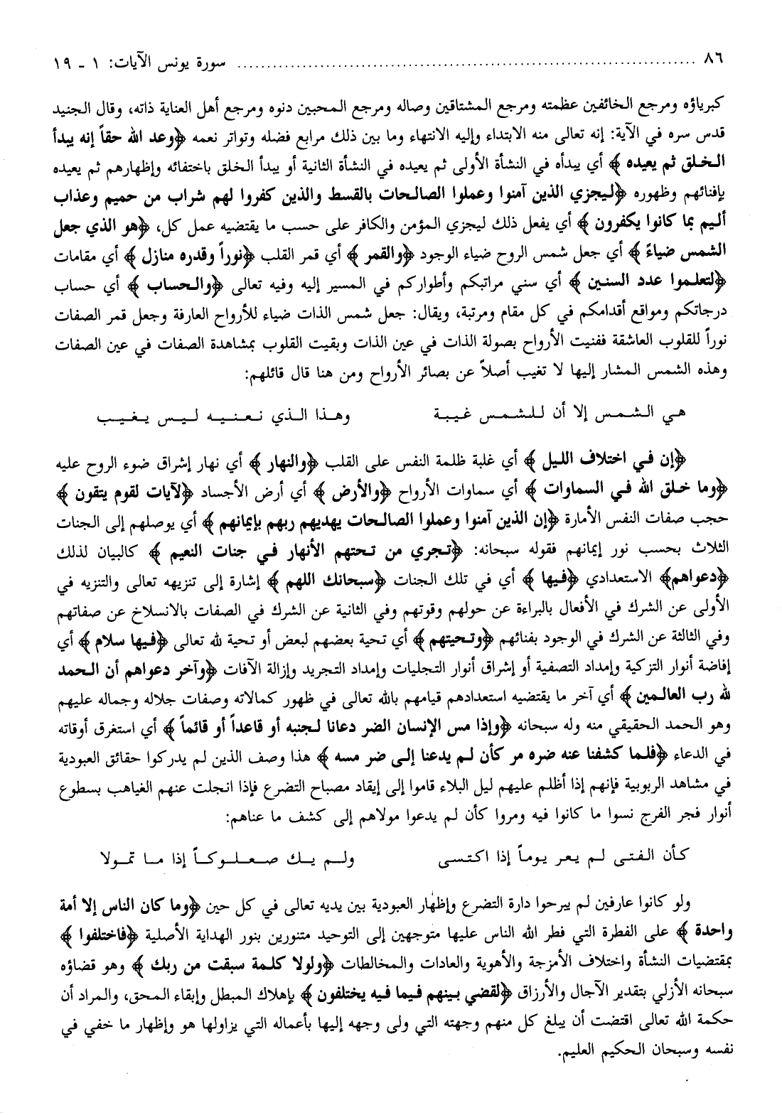 كبرياؤه ومرجع الخائفين عظمته ومرجع المشتاقين وصاله ومرجع المحبين دنوه ومرجع أهل العناية ذاته، وقال الجنيد قدس سره في الآية: إنه تعالى منه الابتداء وإليه الانتهاء وما بين ذلك مرابع فضله وتواتر نعمه وَعْدَ اللَّهِ حَقًّا إِنَّهُ يَبْدَؤُا الْخَلْقَ ثُمَّ يُعِيدُهُ أي يبدأه في النشأة الأولى ثم يعيده في النشأة الثانية أو يبدأ الخلق باختفائه وإظهارهم ثم يعيده بإفنائهم وظهوره لِيَجْزِيَ الَّذِينَ آمَنُوا وَعَمِلُوا الصَّالِحاتِ بِالْقِسْطِ وَالَّذِينَ كَفَرُوا لَهُمْ شَرابٌ مِنْ حَمِيمٍ وَعَذابٌ أَلِيمٌ بِما كانُوا يَكْفُرُونَ أي يفعل ذلك ليجزي المؤمن والكافر على حسب ما يقتضيه عمل كل، هُوَ الَّذِي جَعَلَ الشَّمْسَ ضِياءً أي جعل شمس الروح ضياء الوجود وَالْقَمَرَ أي قمر القلب نُوراً وَقَدَّرَهُ مَنازِلَ أي مقامات لِتَعْلَمُوا عَدَدَ السِّنِينَ أي سني مراتبكم وأطواركم في المسير إليه وفيه تعالى وَالْحِسابَ أي حساب درجاتكم ومواقع أقدامكم في كل مقام ومرتبة، ويقال: جعل شمس الذات ضياء للأرواح العارفة وجعل قمر الصفات نورا للقلوب العاشقة ففنيت الأرواح بصولة الذات في عين الذات وبقيت القلوب بمشاهدة الصفات في عين الصفات وهذه الشمس المشار إليها لا تغيب أصلا عن بصائر الأرواح ومن هنا قال قائلهم:
