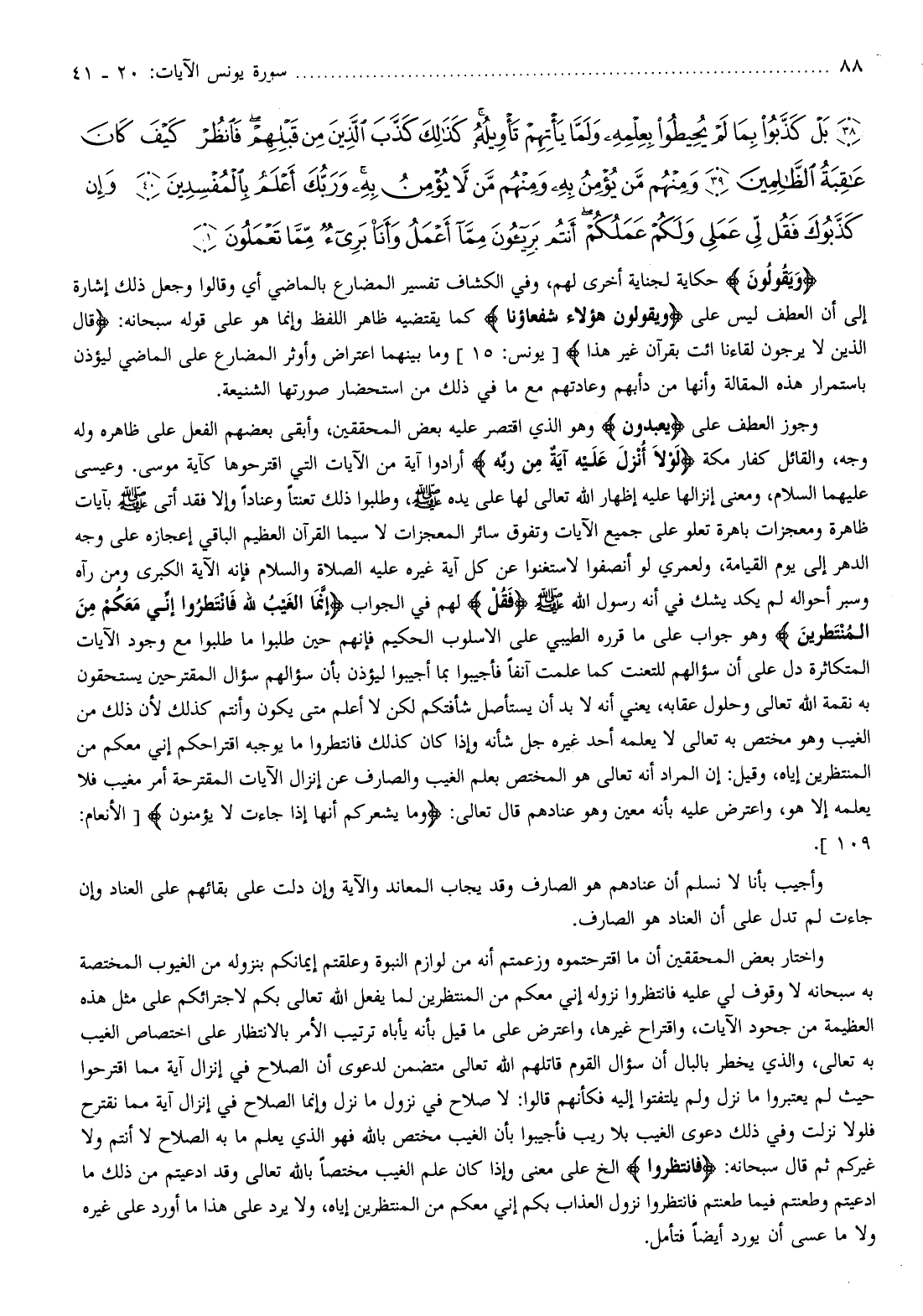 وجوز العطف على يَعْبُدُونَ وهو الذي اقتصر عليه بعض المحققين، وأبقى بعضهم الفعل على ظاهره وله وجه، والقائل كفار مكة لَوْلا أُنْزِلَ عَلَيْهِ آيَةٌ مِنْ رَبِّهِ أرادوا آية من الآيات التي اقترحوها كآية موسى. وعيسى عليهما السلام، ومعنى إنزالها عليه إظهار الله تعالى لها على يده صلّى الله عليه وسلم، وطلبوا ذلك تعنتا وعنادا وإلا فقد أتى صلّى الله عليه وسلم بآيات ظاهرة ومعجزات باهرة تعلو على جميع الآيات وتفوق سائر المعجزات لا سيما القرآن العظيم الباقي إعجازه على وجه الدهر إلى يوم القيامة، ولعمري لو أنصفوا لاستغنوا عن كل آية غيره عليه الصلاة والسلام فإنه الآية الكبرى ومن رآه وسبر أحواله لم يكد يشك في أنه رسول الله صلّى الله عليه وسلم فَقُلْ لهم في الجواب إِنَّمَا الْغَيْبُ لِلَّهِ فَانْتَظِرُوا إِنِّي مَعَكُمْ مِنَ الْمُنْتَظِرِينَ وهو جواب على ما قرره الطيبي على الأسلوب الحكيم فإنهم حين طلبوا ما طلبوا مع وجود الآيات المتكاثرة دل على أن سؤالهم للتعنت كما علمت آنفا فأجيبوا بما أجيبوا ليؤذن بأن سؤالهم سؤال المقترحين يستحقون به نقمة الله تعالى وحلول عقابه، يعني أنه لا بد أن يستأصل شأفتكم لكن لا أعلم متى يكون وأنتم كذلك لأن ذلك من الغيب وهو مختص به تعالى لا يعلمه أحد غيره جل شأنه وإذا كان كذلك فانتطروا ما يوجبه اقتراحكم إني معكم من المنتظرين إياه، وقيل: إن المراد أنه تعالى هو المختص بعلم الغيب والصارف عن إنزال الآيات المقترحة أمر مغيب فلا يعلمه إلا هو، واعترض عليه بأنه معين وهو عنادهم قال تعالى: وَما يُشْعِرُكُمْ أَنَّها إِذا جاءَتْ لا يُؤْمِنُونَ [الأنعام: