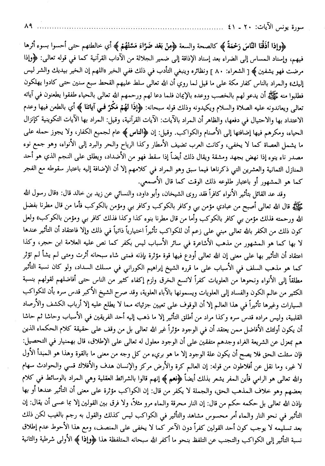 ولعل كون ذلك من الكفر بالله تعالى مبني على زعم أن للكواكب تأثيرا اختيارا ذاتيا في ذلك وإلا فاعتقاد أن التأثير عندها لا بها كما هو المشهور من مذهب الأشاعرة في سائر الأسباب ليس بكفر كما نص عليه العلامة ابن حجر، وكذا اعتقاد أن التأثير بها على معنى إن الله تعالى أودع فيها قوة مؤثرة بإذنه فمتى شاء سبحانه أثرت ومتى لم يشأ لم تؤثر كما هو مذهب السلف في الأسباب على ما قرره الشيخ إبراهيم الكوراني في مسلك السداد، ولو كان نسبة التأثير مطلقا إلى الأنواء ونحوها من العلويات كفرا لا تسع الخرق ولزم إكفاء كثير من الناس حتى أفاضلهم لقولهم بنسبة الكثير من عالم الكون والفساد إلى العلويات ويسمونها بالآباء العلوية، وقد صرح الشيخ الأكبر قدس سره بأن للكواكب السيارات وغيرها تأثيرا في هذا العالم إلا أن الوقوف على تعيين جزئياته مما لا يطلع عليه إلا أرباب الكشف والأرصاد القلبية، وليس مراده قدس سره وكذا مراد من أطلق التأثير إلا ما ذهب إليه أحد الفريقين في الأسباب وحاشا ثم حاشا أن يكون أولئك الأفاضل ممن يعتقد أن في الوجود مؤثرا غير الله تعالى بل من وقف على حقيقة كلام الحكماء الذين هم بمعزل عن الشريعة الغراء وجدهم متفقين على أن الوجود معلول له تعالى على الإطلاق، قال بهمنيار في التحصيل: