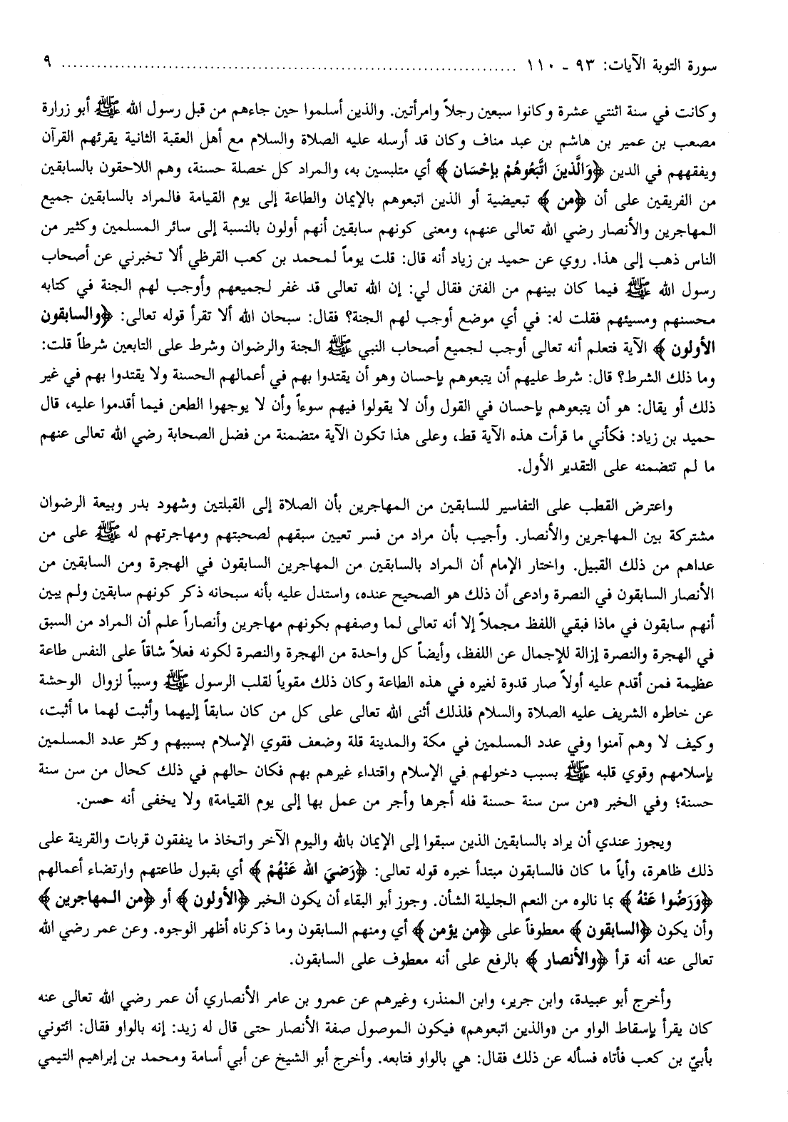 واعترض القطب على التفاسير للسابقين من المهاجرين بأن الصلاة إلى القبلتين وشهود بدر وبيعة الرضوان مشتركة بين المهاجرين والأنصار. وأجيب بأن مراد من فسر تعيين سبقهم لصحبتهم ومهاجرتهم له صلّى الله عليه وسلم على من عداهم من ذلك القبيل. واختار الإمام أن المراد بالسابقين من المهاجرين السابقون في الهجرة ومن السابقين من الأنصار السابقون في النصرة وادعى أن ذلك هو الصحيح عنده، واستدل عليه بأنه سبحانه ذكر كونهم سابقين ولم يبين أنهم سابقون في ماذا فبقي اللفظ مجملا إلا أنه تعالى لما وصفهم بكونهم مهاجرين وأنصارا علم أن المراد من السبق في الهجرة والنصرة إزالة للإجمال عن اللفظ، وأيضا كل واحدة من الهجرة والنصرة لكونه فعلا شاقا على النفس طاعة عظيمة فمن أقدم عليه أولا صار قدوة لغيره في هذه الطاعة وكان ذلك مقويا لقلب الرسول صلّى الله عليه وسلم وسببا لزوال الوحشة عن خاطره الشريف عليه الصلاة والسلام فلذلك أثنى الله تعالى على كل من كان سابقا إليهما وأثبت لهما ما أثبت، وكيف لا وهم آمنوا وفي عدد المسلمين في مكة والمدينة قلة وضعف فقوي الإسلام بسببهم وكثر عدد المسلمين بإسلامهم وقوي قلبه صلّى الله عليه وسلم بسبب دخولهم في الإسلام واقتداء غيرهم بهم فكان حالهم في ذلك كحال من سن سنة حسنة