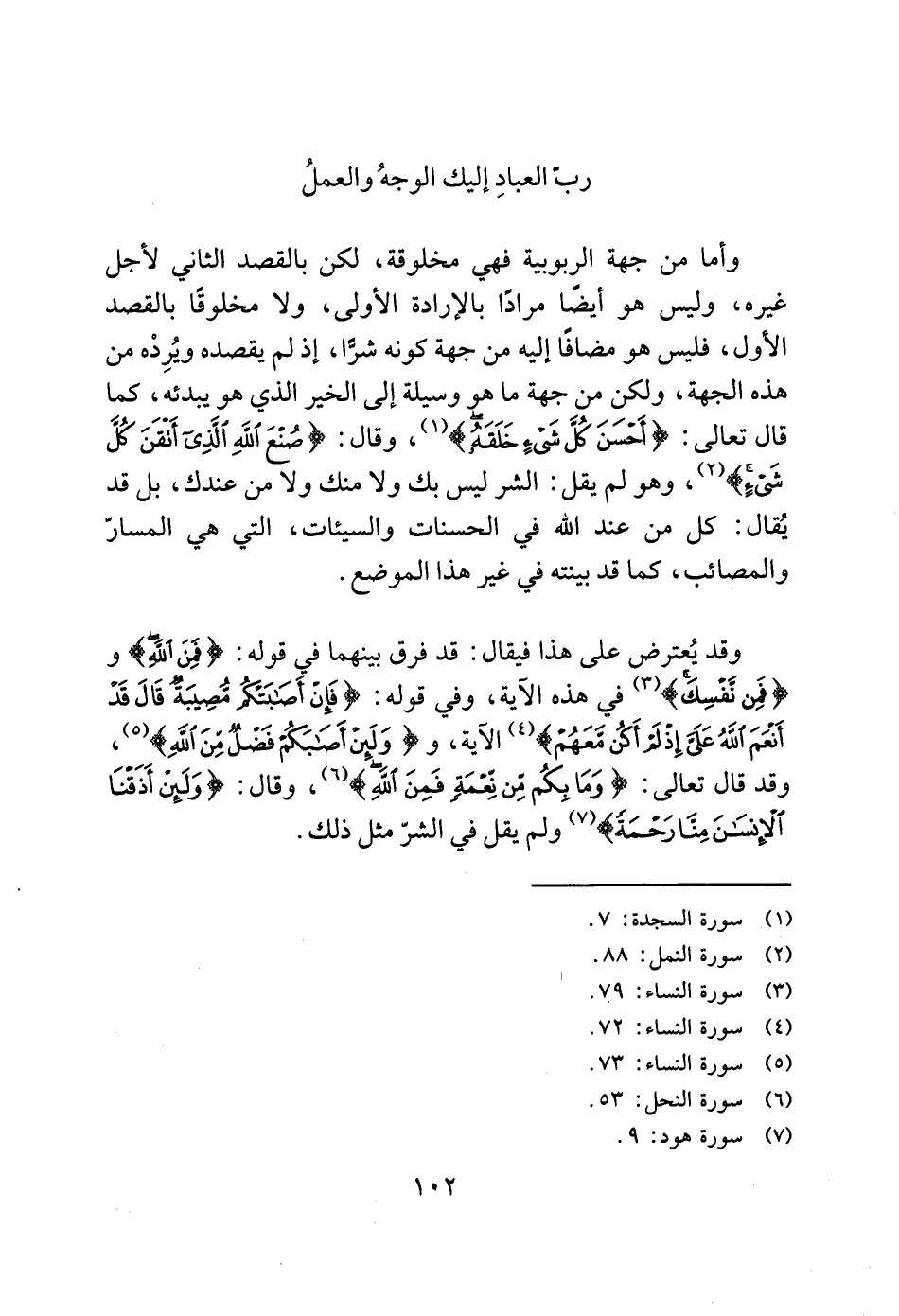 وأما من جهة الربوبية فهي مخلوقة، لكن بالقصد الثاني لأجل غيره، وليس هو أيضَا مرادًا بالإرادة الأولى، ولا مخلوقًا بالقصد الأول، فليس هو مضافَا إليه من جهة كونه شرَّا، إذ لم يقصده ويُرِدْه من هذه الجهة، ولكنِ من جهة ما هو وسيلة إلى الخير الذي هو يبدئه، كما قال تعالى: (أَحْسَنَ كُلَّ شَيْءٍ خَلَقَهُ) (1)، وقال: (صُنْعَ اللَّهِ الَّذِي أَتْقَنَ كُلَّ شَيْءٍ) (2)، وهو لم يقل: الشر ليس بك ولا منك ولا من عندك، بل قد يُقال: كل من عند الله في الحسنات والسيئات، التي هي المسارّ والمصائب، كما قد بينته في غير هذا الموضع.