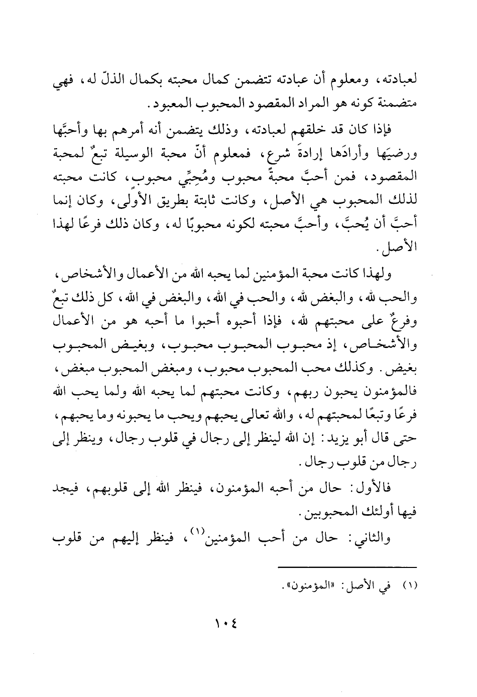 ولهذا كانت محبة المؤمنين لما يحبه الله من الأعمال والأشخاص، والحب لله، والبغض دئه، والحب في الله، والبغض في الله، كل ذلك تبعٌ وفرعٌ على محبتهم لله، فإذا أحبوه أحبوا ما أحبه هو من الأعمال والأشخاص، إذ محبوب المحبوب محبوب، وبغيض المحبوب بغيض. وكذلك محب المحبوب محبوب، ومبغض المحبوب مبغض، فالمؤمنون يحبون ربهم، وكانت محبتهم لما يحبه الله ولما يحب الله فرعًا وتبعًا لمحبتهم له، والله تعالى يحبهم ويحب ما يحبونه وما يحبهم، حتى قال أبو يزيد: إن الله لينظر إلى رجال في قلوب رجال، وينظر إلى رجال من قلوب رجال.