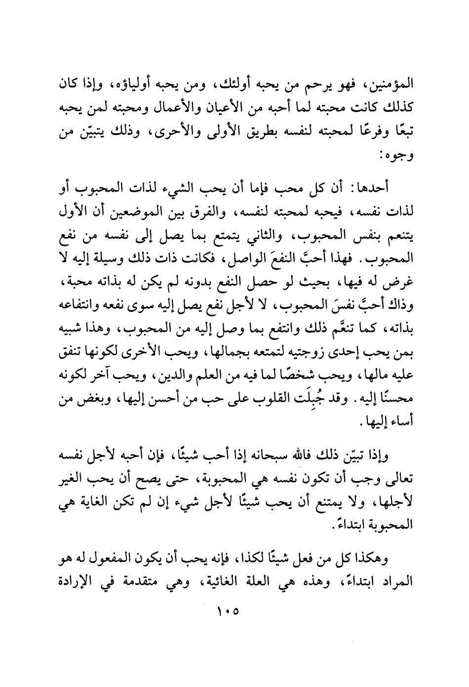 وإذا تبيّن ذلك فالله سبحانه إذا أحب شيئًا، فإن أحبه لأجل نفسه تعالى وجب أن تكون نفسه هي المحبوبة، حتى يصح أن يحب الغير لأجلها، ولا يمتنع أن يحب شيئًا لأجل شيء إن لم تكن الغاية هي المحبوبة ابتداءً.