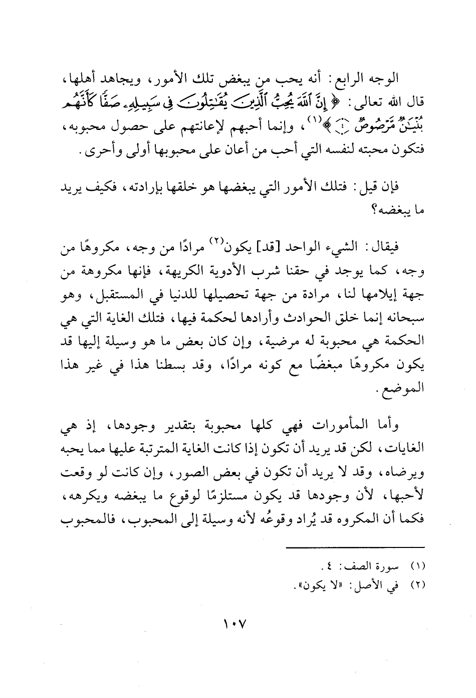 الوجه الرابع: أنه يحب من يبغض تلك الأمور، ويجاهد أهلها، قال الله تعالى: (إِنَّ اللَّهَ يُحِبُّ الَّذِينَ يُقَاتِلُونَ فِي سَبِيلِهِ صَفًّا كَأَنَّهُمْ بُنْيَانٌ مَرْصُوصٌ (4)) (1)، وإنما أحبهم لإعانتهم على حصول محبوبه، فتكون محبته لنفسه التي أحب من أعان على محبوبها أولى وأحرى.
