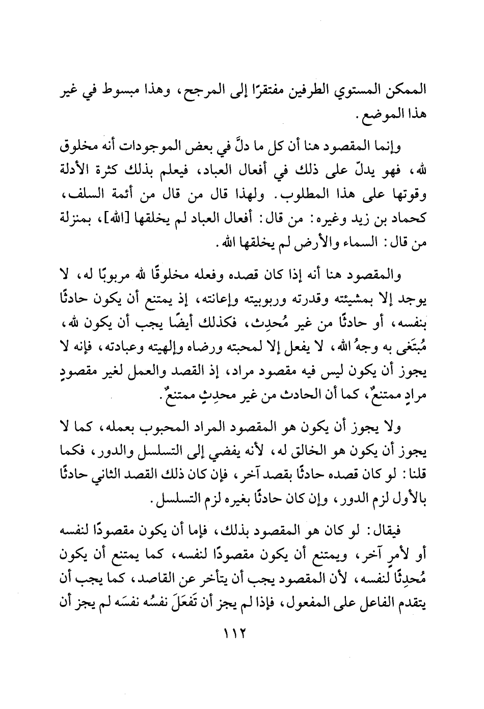 ولا يجوز أن يكون هو المقصود المراد المحبوب بعمله، كما لا يجوز أن يكون هو الخالق له، لأنه يفضي إلى التسلسل والدور، فكما قلنا: لو كان قصده حادثًا بقصد آخر، فإن كان ذلك القصد الثاني حادثًا بالأول لزم الدور، وإن كان حادثًا بغيره لزم التسلسل.