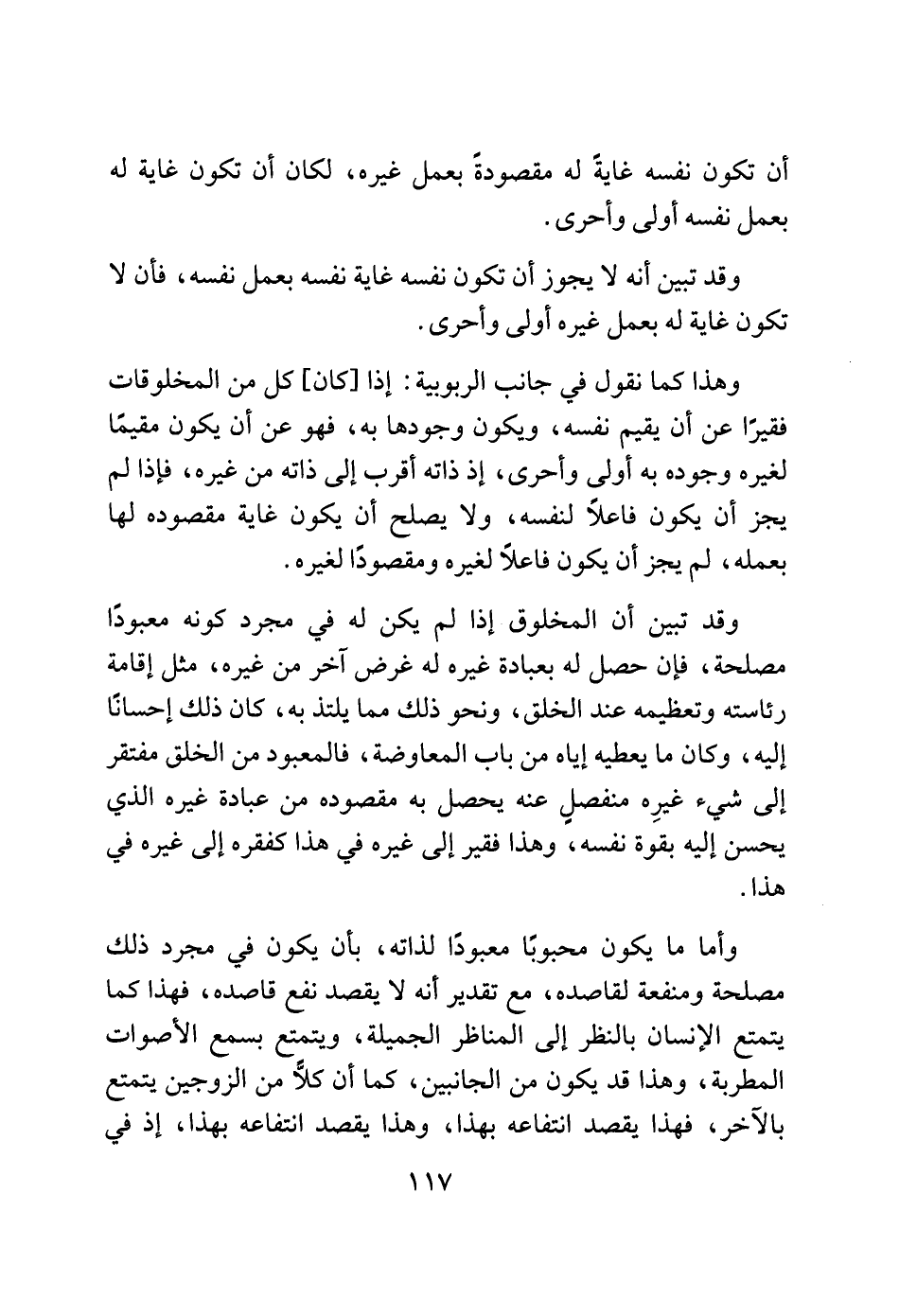 وقد تبين أنه لا يجوز أن تكون نفسه غاية نفسه بعمل نفسه، فأن لا تكون غاية له بعمل غيره أولى وأحرى.