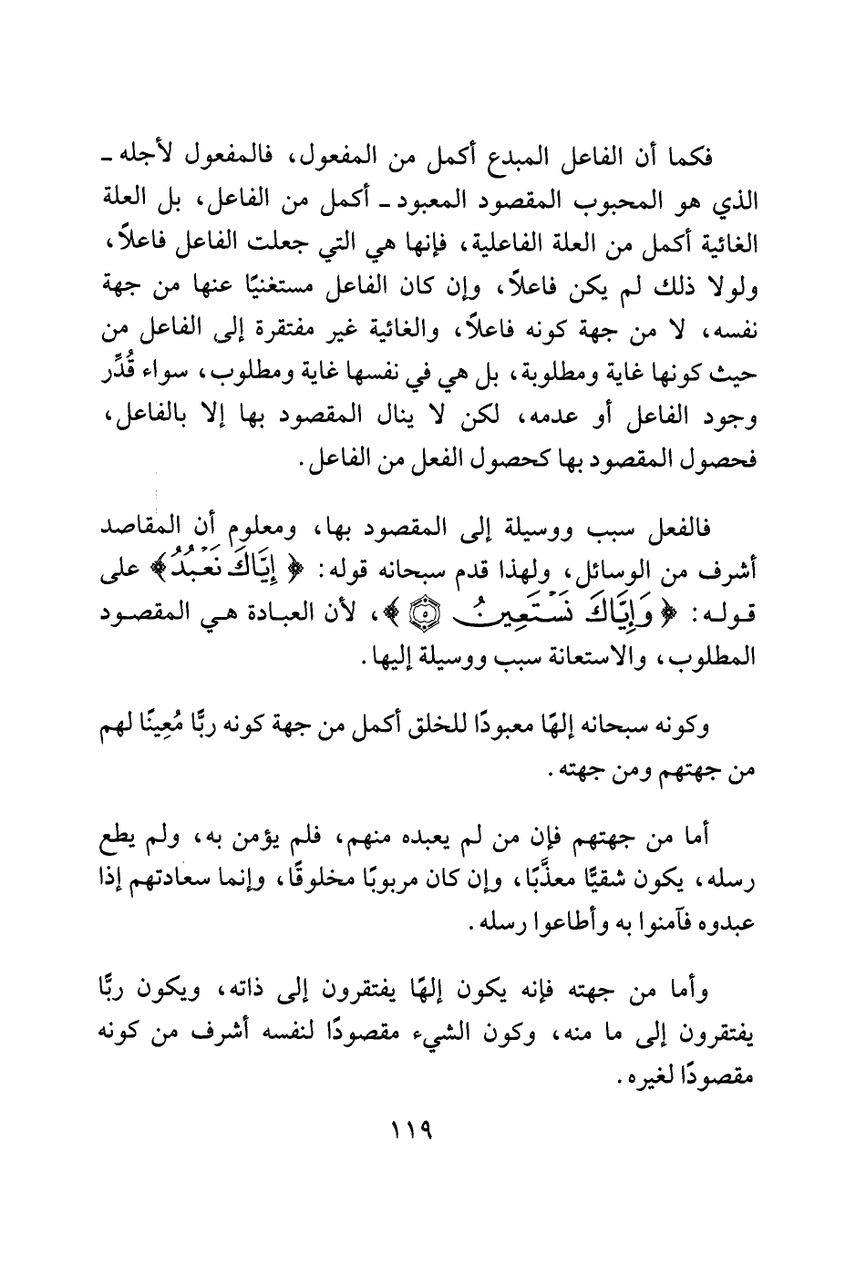 فكما أن الفاعل المبدع أكمل من المفعول، فالمفعول لأجله- الذي هو المحبوب المقصود المعبود- أكمل من الفاعل، بل العلة الغائية أكمل من العلة الفاعلية، فإنها هي التي جعلت الفاعل فاعلاً، ولولا ذلك لم يكن فاعلاً، وإن كان الفاعل مستغنيًا عنها من جهة نفسه، لا من جهة كونه فاعلاً، والغائية غير مفتقرة إلى، الفاعل من حيث كونها غاية ومطلوبة، بل هي في نفسها غاية ومطلوب، سواء قُدِّر وجود الفاعل أو عدمه، لكن لا ينال المقصود بها إلا بالفاعل، فحصول المقصود بها كحصول الفعل من الفاعل.