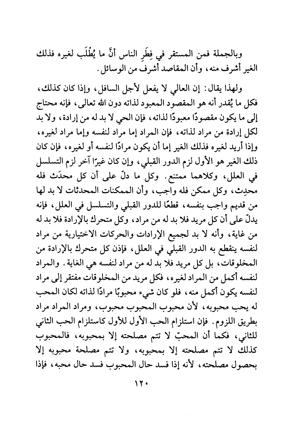 ولهذا يقال: إن العالي لا يفعل لأجل السافل، وإذا كان كذلك، فكل ما يُقدر أنه هو المقصود المعبود لذاته دون الله تعالى، فإنه محتاج إلى ما يكون مقصودًا معبودًا لذاته، فإن الحي لا بد له من إرادة، ولا بد لكل إرادة من مراد لذاته، فإن المراد إما مراد لنفسه وإما مراد لغيره، واذا أريد لغيره فذلك الغير إما أن يكون مرادًا لنفسه أو لغيره، فإن كان ذلك الغير هو الأول لزم الدور القبلي، وان كان غيرًا آخر لزم التسلسل في العلل، وكلاهما ممتنع. وكل ما دل على أن كل محدَث فله محدِث، وكل ممكن فله واجب، وأن الممكنات المحدثات لا بد لها من قديم واجب بنفسه، قطعًا للدور القبلي والتسلسل في العلل، فإنه يدلّ على أن كل مريد فلا بد له من مراد، وكل متحرك بالإرادة فلا بد له من غاية، وأنه لا بد لجميع الإرادات والحركات الاختيارية من مراد لنفسه ينقطع به الدور القبلي في العلل، فإذن كل متحرك بالإرادة من المخلوقات، بل كل مريد فلا بد له من مراد لنفسه هي الغاية. والمراد لنفسه أكمل من المراد لغيره، فكل مريد من المخلوقات مفتقر إلى مراد لنفسه يكون أكمل منه، فلو كان شيء محبوبًا مرادًا لذاته لكان المحب له يحب محبوبه، لأن محبوب المحبوب محبوب، ومراد المراد مراد بطريق اللزوم. فإن استلزام الحب الأول للأول كاستلزام الحب الثاني للثاني، فكما أن المحبّ لا تتم مصلحته إلا بمحبوبه، فالمحبوب كذلك لا تتم مصلحته إلا بمحبوبه، ولا تتم مصلحة محبوبه إلا بحصول مصلحته، لأنه إذا فسد حال المحبوب فسد حال محبه، فإذا
