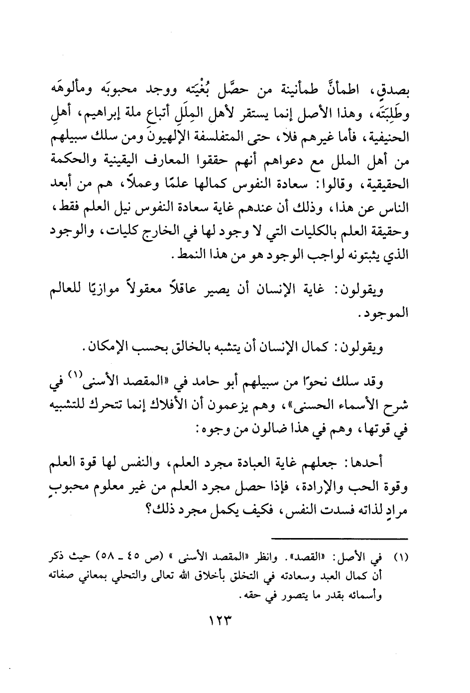 وقد سلك نحوَا من سبيلهم أبو حامد في "المقصد الأسنى (1) في شرح الأسماء الحسنى"، وهم يزعمون أن الأفلاك إنما تتحرك للتشبيه في قوتها، وهم في هذا ضالون من وجوه: