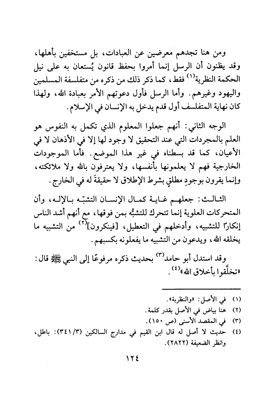 ومن هنا تجدهم معرضين عن العبادات، بل مستخفين بأهلها، وقد يظنون أن الرسل إنما أمروا بحفظ قانون يُستعان به على نيل الحكمة النظرية (1) فقط، كما ذكر ذلك من ذكره من متفلسفة المسلمين واليهود وغيرهم. وأما الرسل فأول دعوتهم الأمر بعبادة الله، ولهذا كان نهاية المتفلسف أول قدم يدخل به الإنسان في الإسلام.
