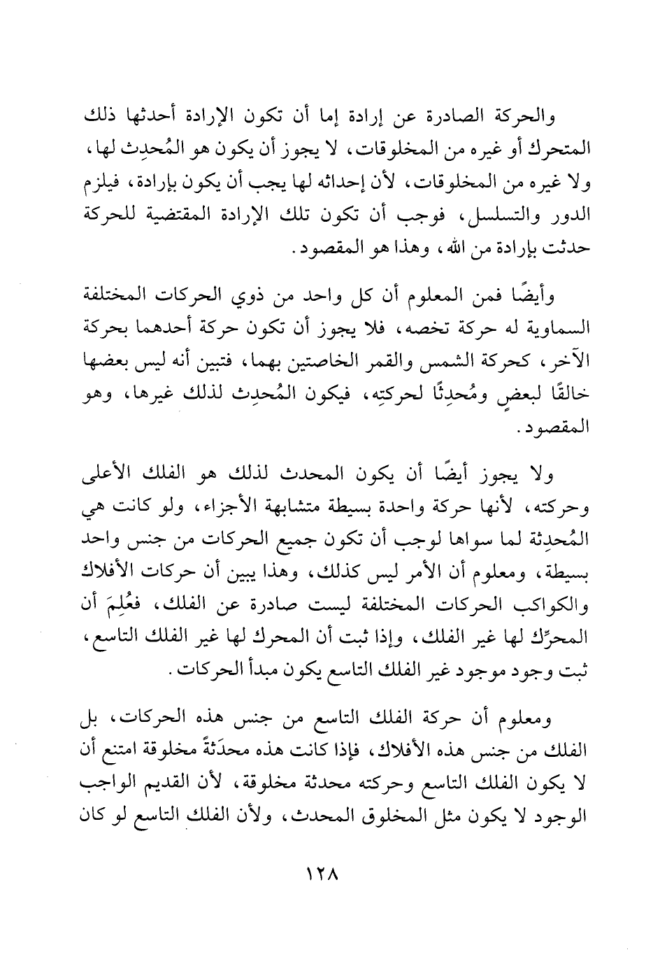 ولا يجوز أيضا أن يكون المحدث لذلك هو الفلك الأعلى وحركته، لأنها حركة واحدة بسيطة متشابهة الأجزاء، ولو كانت هي المُحدِثة لما سواها لوجب أن تكون جميع الحركات من جنس واحد بسيطة، ومعلوم أن الأمر ليس كذلك، وهذا يبين أن حركات الأفلاك والكواكب الحركات المختلفة ليست صادرة عن الفلك، فعُلِمَ أن المحرِّك لها غير الفلك، وإذا ثبت أن المحرك لها غير الفلك التاسع، ثبت وجود موجود غير الفلك التاسع يكون مبدأ الحركات.