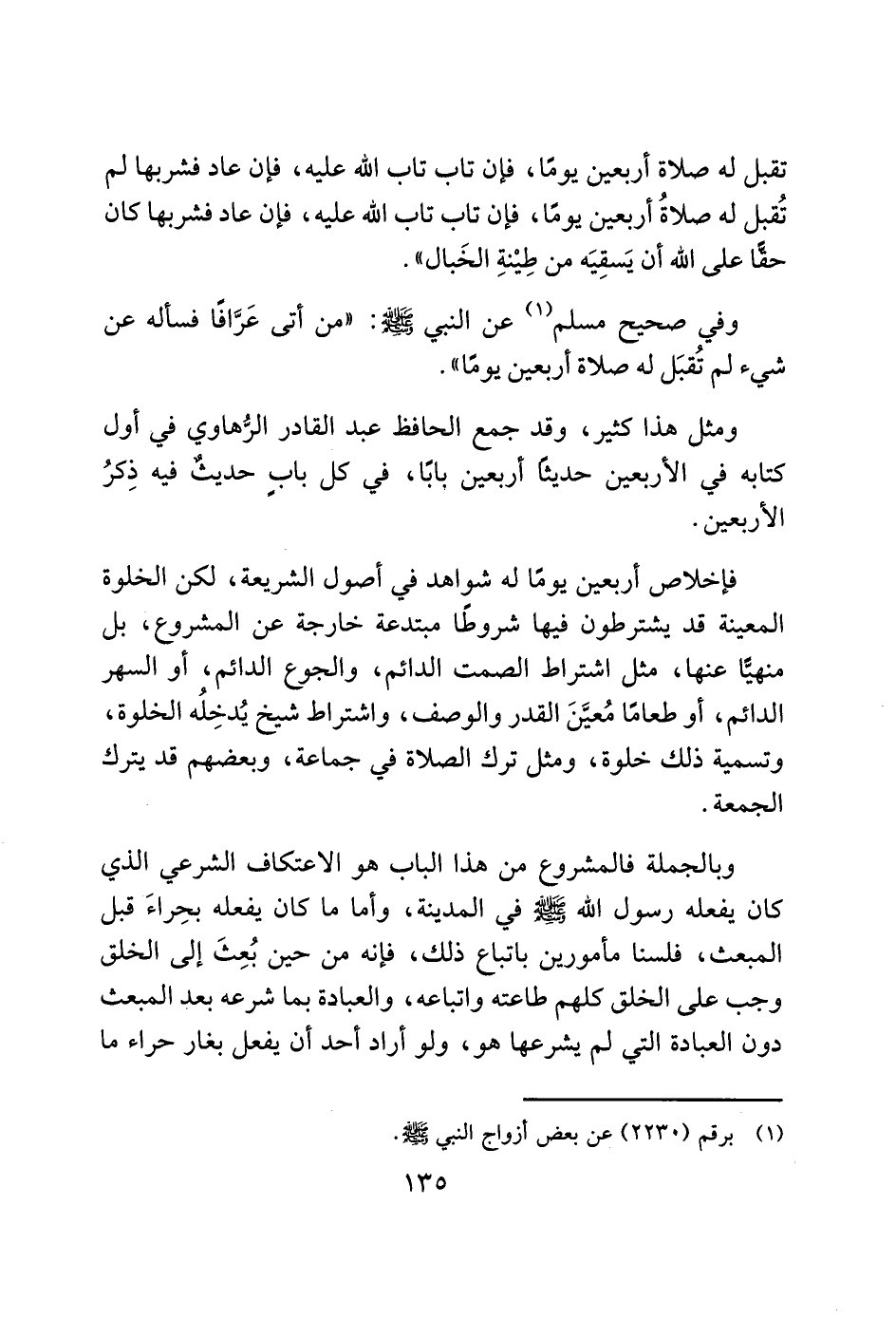فإخلاص أربعين يومًا له شواهد في أصول الشريعة، لكن الخلوة المعينة قد يشترطون فيها شروطًا مبتدعة خارجة عن المشروع، بل منهيًّا عنها، مثل اشتراط الصمت الدائم، والجوع الدائم، أو السهر الدائم، أو طعامًا مُعيَّنَ القدر والوصف، واشتراط شيخ يُدخِلُه الخلوة، وتسمية ذلك خلوة، ومثل ترك الصلاة في جماعة، وبعضهم قد يترك الجمعة.