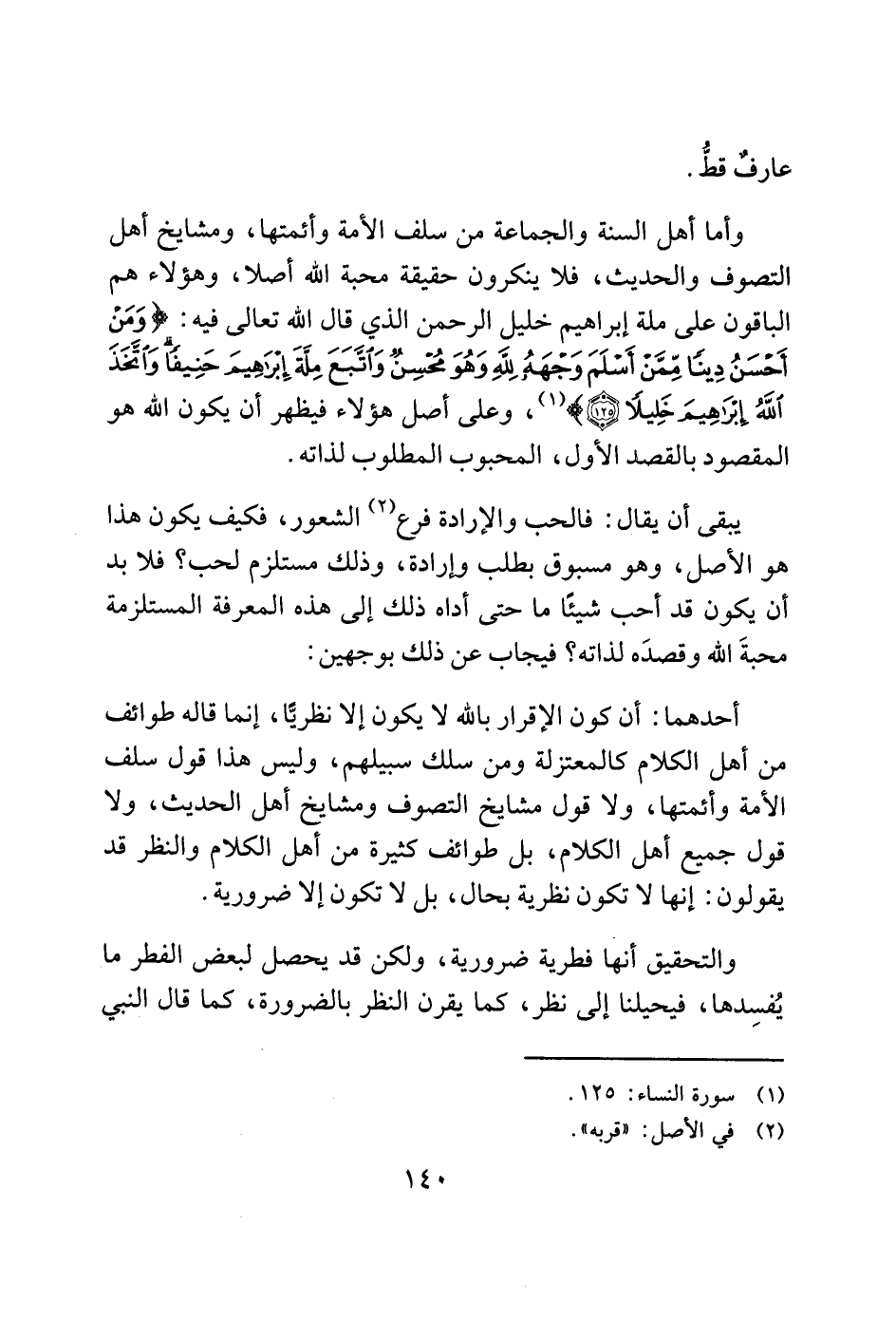 وأما أهل السنة والجماعة من سلف الأمة وأئمتها، ومشايخ أهل التصوف والحديث، فلا ينكرون حقيقة محبة الله أصلا، وهؤلاء هم الباقون على ملة إبراهيم خليل الرحمن الذي قال الله تعالى فيه: (وَمَنْ أَحْسَنُ دِينًا مِمَّنْ أَسْلَمَ وَجْهَهُ لِلَّهِ وَهُوَ مُحْسِنٌ وَاتَّبَعَ مِلَّةَ إِبْرَاهِيمَ حَنِيفًا وَاتَّخَذَ اللَّهُ إِبْرَاهِيمَ خَلِيلًا (125)) (1)، وعلى أصل هؤلاء فيظهر أن يكون الله هو المقصود بالقصد الأول، المحبوب المطلوب لذاته.