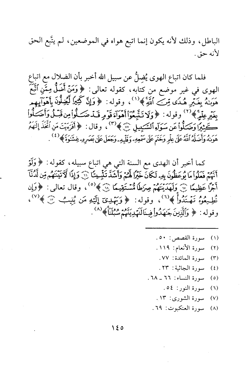 فلما كان اتباع الهوى يُضِلُّ عن سبيل الله أخبر بأن الضلال مع اتباعِ الهوى في غير موضع من كتابه، كقوله تعالى: (وَمَنْ أَضَلُّ مِمَّنِ اتَّبَعَ هَوَاهُ بِغَيْرِ هُدًى مِنَ اللَّهِ) (1)، وقوله: (وَإِنَّ كَثِيرًا لَيُضِلُّونَ بِأَهْوَائِهِمْ بِغَيْرِ عِلْمٍ) (2) وقوله: (وَلَا تَتَّبِعُوا أَهْوَاءَ قَوْمٍ قَدْ ضَلُّوا مِنْ قَبْلُ وَأَضَلُّوا كَثِيرًا وَضَلُّوا عَنْ سَوَاءِ السَّبِيلِ (77)) (3) وقال: (أَفَرَأَيْتَ مَنِ اتَّخَذَ إِلَهَهُ هَوَاهُ وَأَضَلَّهُ اللَّهُ عَلَى عِلْمٍ وَخَتَمَ عَلَى سَمْعِهِ وَقَلْبِهِ وَجَعَلَ عَلَى بَصَرِهِ غِشَاوَةً) (4).