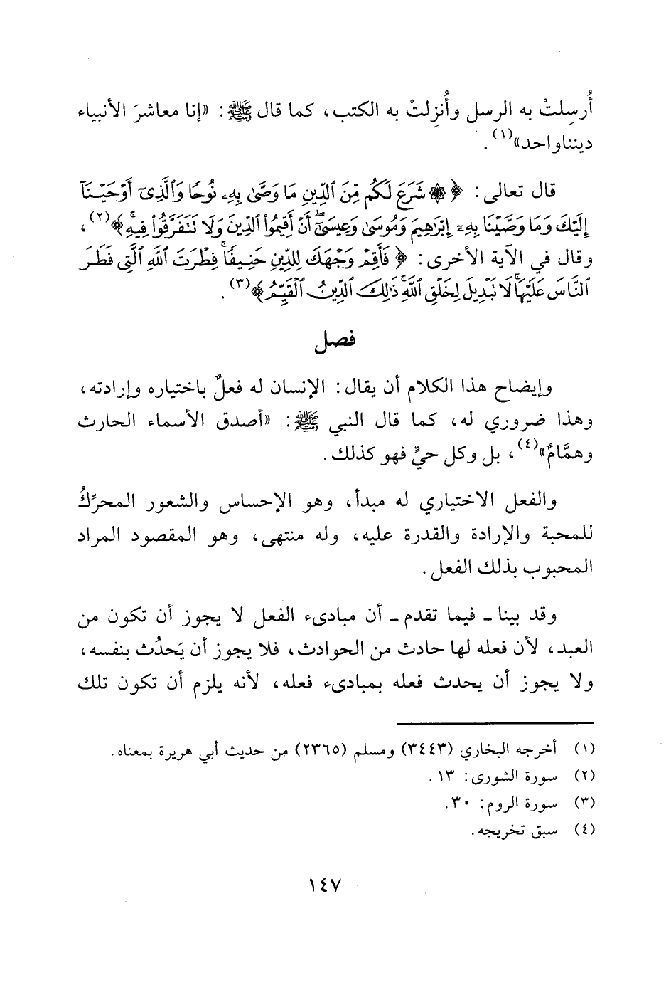 وإيضاح هذا الكلام أن يقال: الإنسان له فعلٌ باختياره وإرادته، وهذا ضروري له، كما قال النبي - صَلَّى اللَّهُ عَلَيْهِ وَسَلَّمَ -:" أصدق الأسماء الحارث وهمَّامٌ " (4)، بل وكل حيٍّ فهو كذلك.