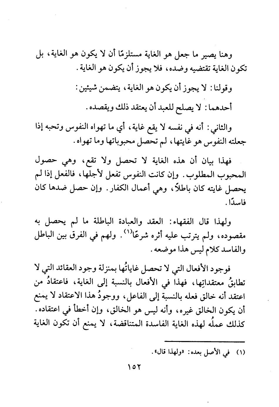فوجود الأفعال التي لا تحصل غاياتُها بمنزلة وجود العقائد التي لا تطابقُ معتقداتِها، فهذا في الأفعال بالنسبة إلى الغاية، فاعتقادُ من اعتقد أنه خالق فعله بالنسبة إلى الفاعل، ووجودُ هذا الاعتقاد لا يمنع أن يكون الخالق غيره، وأنه ليس هو الخالق، وإن أخطأ في اعتقاده. كذلك عملُه لهذه الغاية الفاسدة المتناقضة، لا يمنع أن تكون الغاية