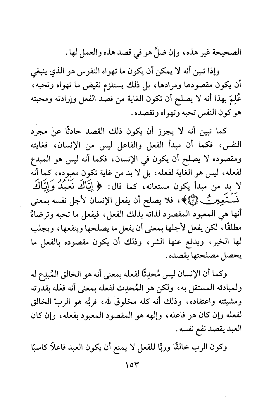 كما تبين أنه لا يجوز أن يكون ذلك القصد حادثًا عن مجرد النفس، فكما أن مبدأ الفعل والفاعل ليس من الإنسان، فغايته ومقصوده لا يصلح أن يكون في الإنسان، فكما أنه ليس هو المباع لفعله، ليس هو الغاية لفعله، بل لا بد من غاية تكون معِبوده، كما أنه لاِ بد من مبدأ يكون مستعانه، كما قال: (إِيَّاكَ نَعْبُدُ وَإِيَّاكَ نَسْتَعِينُ (5)) فلا يصلح أن يفعل الإنسان لأجل نفسه بمعنى أنها هي المعبود المقصود لذاته بذلك الفعل، فيفعل ما تحبه وترضاهُ مطلقًا، لكن يفعل لأجلها بمعنى أن يفعل ما يصلحها وينفعها، ويجلب لها الخير، ويدفع عنها الشر، وذلك أن يكون مقصوده بالفعل ما يحصل مصلحتها بقصده.
