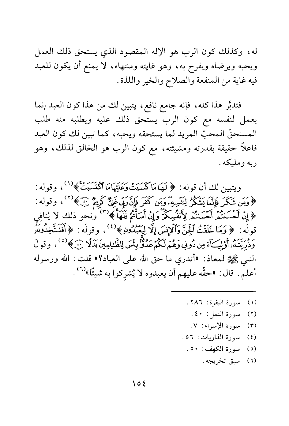 ويتبين لك أن قوله: (لَهَا مَا كَسَبَتْ وَعَلَيْهَا مَا اكْتَسَبَتْ) (1)، وقوله: (وَمَنْ شَكَرَ فَإِنَّمَا يَشْكُرُ لِنَفْسِهِ وَمَنْ كَفَرَ فَإِنَّ رَبِّي غَنِيٌّ كَرِيمٌ (40)) (2)، وقوله: (إِنْ أَحْسَنْتُمْ أَحْسَنْتُمْ لِأَنْفُسِكُمْ وَإِنْ أَسَأْتُمْ فَلَهَا) (3) ونحو ذلك لا يُنافِي قولَه: (وَمَا خَلَقْتُ الْجِنَّ وَالْإِنْسَ إِلَّا لِيَعْبُدُونِ) (4)، وقولَه: (أَفَتَتَّخِذُونَهُ وَذُرِّيَّتَهُ أَوْلِيَاءَ مِنْ دُونِي وَهُمْ لَكُمْ عَدُوٌّ بِئْسَ لِلظَّالِمِينَ بَدَلًا (50)) (5)، وقولَ النبي - صَلَّى اللَّهُ عَلَيْهِ وَسَلَّمَ - لمعاذ: "أتدري ما حق الله على العباد؟ " قلت: الله ورسوله أعلم. قال: "حقه عليهم أن يعبدوه لا يُشرِكوا به شيئًا" (6).
