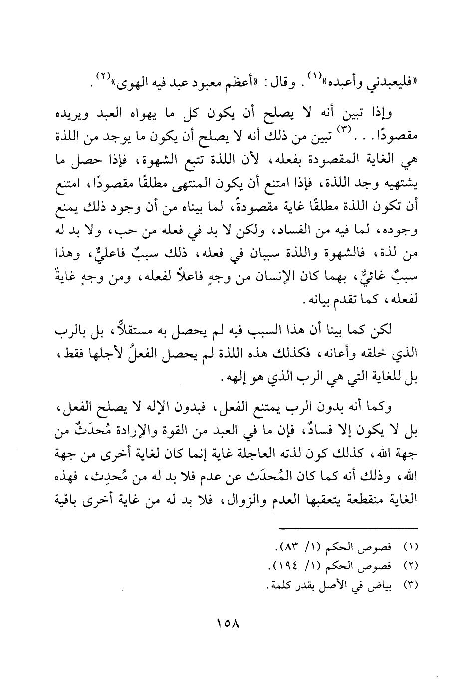 لكن كما بينا أن هذا السبب فيه لم يحصل به مستقلاًّ، بل بالرب الذي خلقه وأعانه، فكذلك هذه اللذة لم يحصل الفعلُ لأجلها فقط، بل للغاية التي هي الرب الذي هو إلهه.