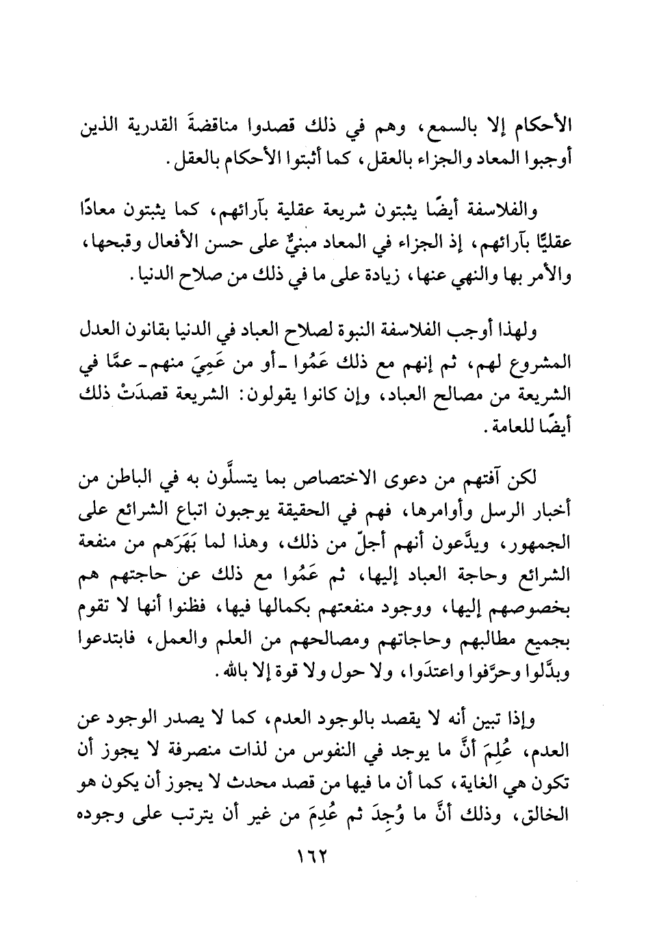 ولهذا أوجب الفلاسفة النبوة لصلاح العباد في الدنيا بقانون العدل المشروع لهم، ثم إنهم مع ذلك عَمُوا- أو من عَمِيَ منهم- عمَّا في الشريعة من مصالح العباد، وإن كانوا يقولون: الشريعة قصدَتْ ذلك أيضا للعامة.