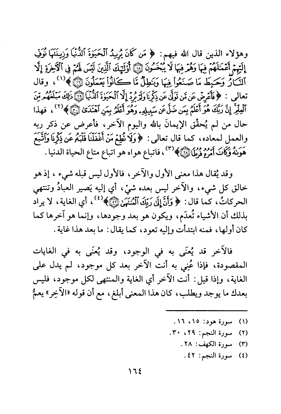 وقد يُقال هذا معنى الأول والاَخر، فالأول ليس قبله شيء، إذ هو خالق كل شيء، والاَخر ليس بعده شى، أي إليه يَصير العبادُ وتنتهي الحركاتُ، كما قال: (وَأَنَّ إِلَى رَبِّكَ الْمُنْتَهَى (42)) (4)، أي الغاية، لا يراد بذلك أن الأشياء تُعدَم، ويكون هو بعد وجودها، وإنما هو آخرها كما كان أولها، فمنه ابتدأت واليه تعود، كما يقال: ما بعد هذا غاية.