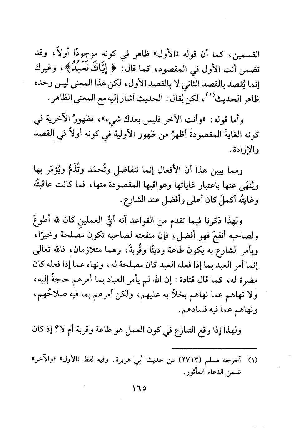 القسمين، كما أن قوله "الأول " ظاهر في كونه موجودًا أولاً، وقد تضمن أنت الأول في المقصود، كما قال: (إِيَّاكَ نَعْبُدُ) وغيرك إنما يُقصد بالقصد الثاني لا بالقصد الأول، لكن هذا المعنى ليس وحده ظاهر الحديث (1)، لكن يُقال: الحديث أشار إليه مع المعنى الظاهر.