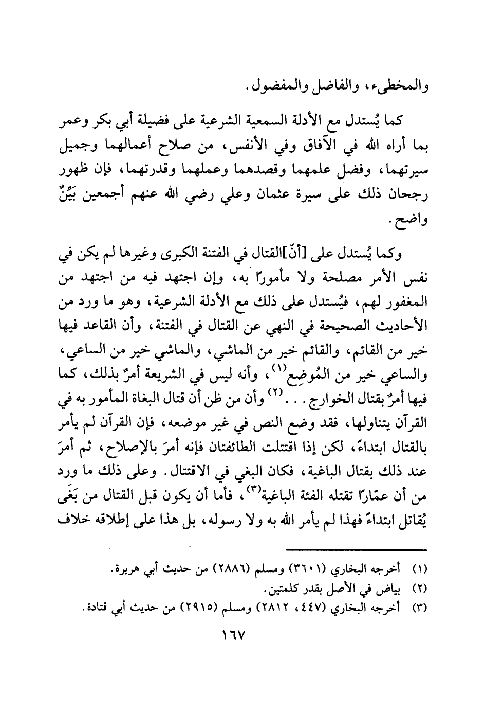 وكما يُستدل على [أنّ] القتال في الفتنة الكبرى وغيرها لم يكن في نفس الأمر مصلحة ولا مامورًا به، وإن اجتهد فيه من اجتهد من المغفور لهم، فيُستدل على ذلك مع الأدلة الشرعية، وهو ما ورد من الأحاديث الصحيحة في النهي عن القتال في الفتنة، وأن القاعد فيها خير من القائم، والقائم خير من الماشي، والماشي خير من الساعي، والساعي خير من المُوضِع (1)، وأنه ليس في الشريعة أمرٌ بذلك، كما فيها أمرٌ بقتال الخوارج ... (2) وأن من ظن أن قتال البغاة المأمور به في القرآن يتناولها، فقد وضع النص في غير موضعه، فإن القرآن لم يأمر بالقتال ابتداءً، لكن إذا اقتتلت الطائفتان فإنه أمرَ بالإصلاح، ثم أمرَ عند ذلك بقتال الباغية، فكان البغي في الاقتتال. وعلى ذلك ما وِرد من أن عمّارًا تقتله الفئة الباغية (3)، فأما أن يكون قبل القتال من بَغى يُقاتل ابتداءً فهذا لم يأمر الله به ولا رسوله، بل هذا على إطلاقه خلاف