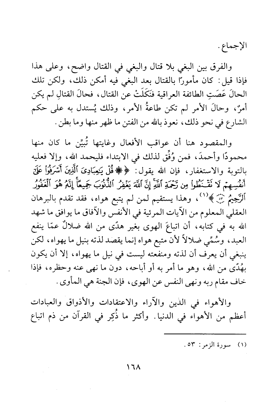 والمقصود هنا أن عواقب الأفعال وغايتها تُبيِّن ما كان منها محمودًا وأحمدَ، فمن وُفِّق لذلك في الابتداء فليحمد الله، وإلا فعليه بالتوبة والاستغفار، فإن الله يقول: (قُلْ يَا عِبَادِيَ الَّذِينَ أَسْرَفُوا عَلَى أَنْفُسِهِمْ لَا تَقْنَطُوا مِنْ رَحْمَةِ اللَّهِ إِنَّ اللَّهَ يَغْفِرُ الذُّنُوبَ جَمِيعًا إِنَّهُ هُوَ الْغَفُورُ الرَّحِيمُ (53)) (1)، وهذا يستقيم لمن لم يتبع هواه، فقد تقدم بالبرهان العقلي المعلوم من الآيات المرئية في الأنفس والاَفاق ما يوافق ما شهد الله به في كتابه، أن اتباعَ الهوى بغير هدًى من الله ضلال عمّا ينفع العبد، وسُمِّي ضلالاً لأن متبع هواه إنما يقصد لذته بنيل ما يهواه، لكن ينبغي أن يعرف أن لذته ومنفعته ليست في نيل ما يهواه، إلا أن يكون بهُدًى من الله، وهو ما أمر به أو أباحه، دون ما نهى عنه وحظره، فإذا خاف مقام ربه ونهى النفس عن الهوى، فإن الجنة هي المأوى.