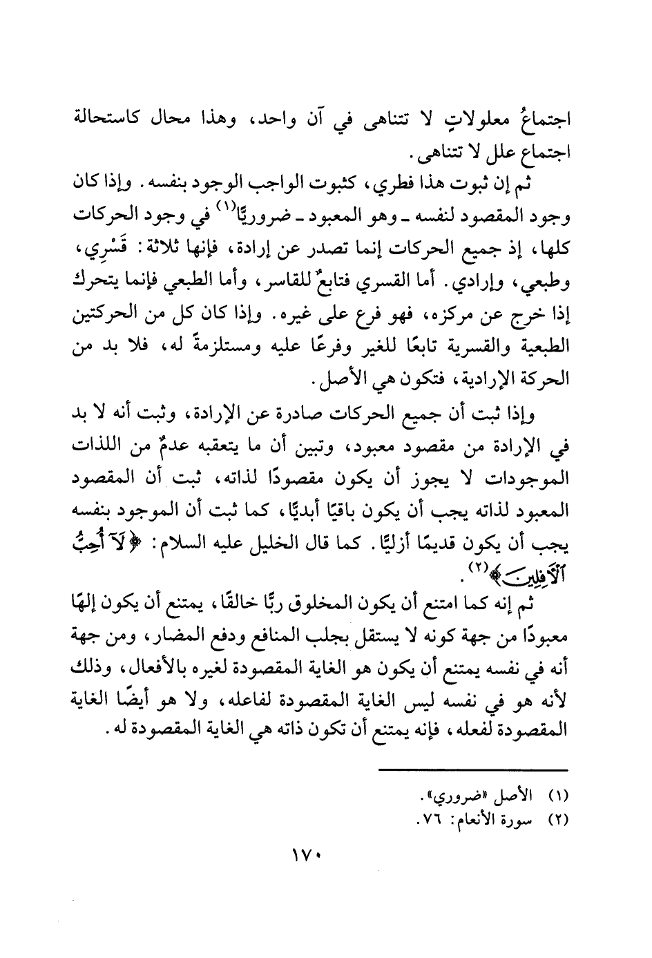 ثم إن ثبوت هذا فطري، كثبوت الواجب الوجود بنفسه. وإذا كان وجود المقصود لنفسه- وهو المعبود- ضروريًّا (1) في وجود الحركات كلها، إذ جميع الحركات إنما تصدر عن إرادة، فإنها ثلاثة: قَسْرِي، وطبعي، وإرادي. أما القسري فتابعٌ للقاسر، وأما الطبعي فإنما يتحرك إذا خرج عن مركزه، فهو فرع على غيره. وإذا كان كل من الحركتين الطبعية والقسرية تابعًا للغير وفرعًا عليه ومستلزمةً له، فلا بد من الحركة الإرادية، فتكون هي الأصل.
