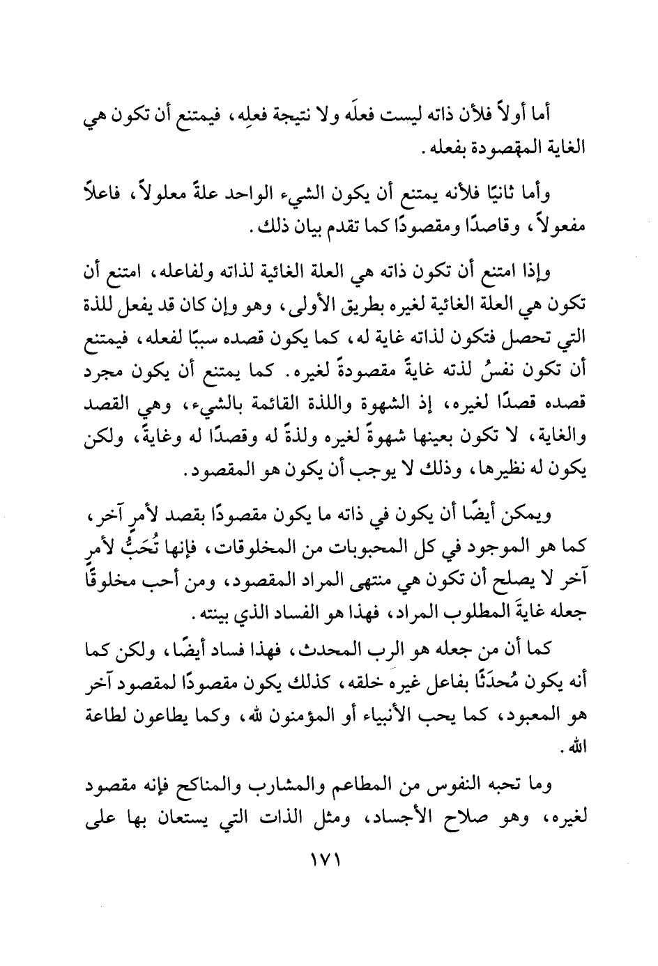 وإذا امتنع أن تكون ذاته هي العلة الغائية لذاته ولفاعله، امتنع أن تكون هي العلة الغائية لغيره بطريق الأولى، وهو وإن كان قد يفعل للذة التي تحصل فتكون لذاته غاية له، كما يكون قصده سببًا لفعله، فيمتنع أن تكون نفسُ لذته غايةً مقصودةَ لغيره. كما يمتنع أن يكون مجرد قصده قصدًا لغيره، إذ الشهوة واللذة القائمة بالشيء، وهي القصد والغاية، لا تكون بعينها شهوةً لغيره ولذةً له وقصدًا له وغايةً، ولكن يكون له نظيرها، وذلك لا يوجب أن يكون هو المقصود.