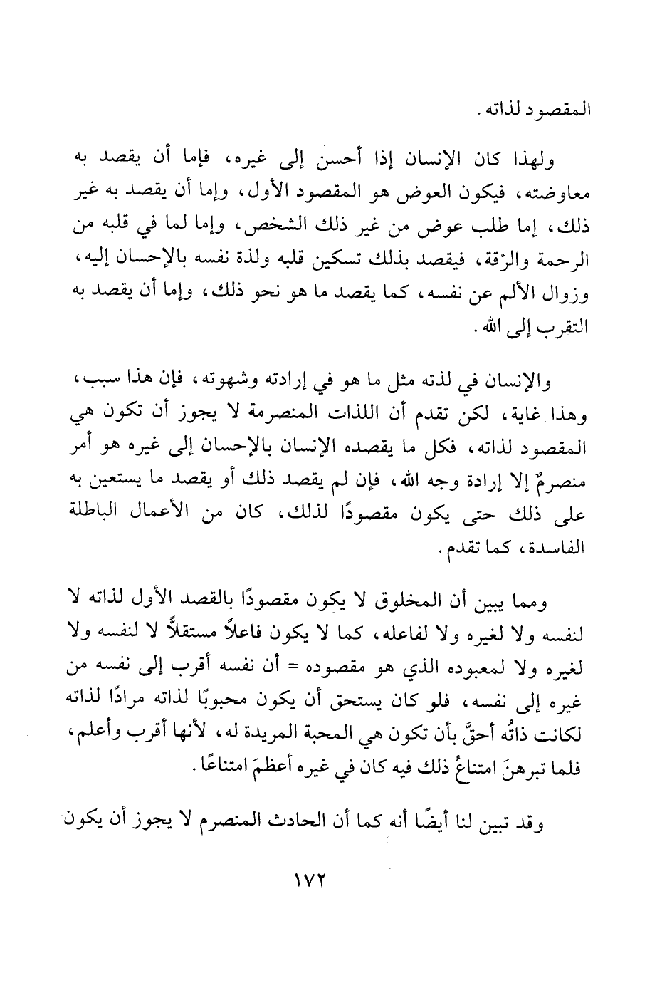 والإنسان في لذته مثل ما هو في إرادته وشهوته، فإن هذا سبب، وهذا غاية، لكن تقدم أن اللذات المنصرمة لا يجوز أن تكون هي المقصود لذاته، فكل ما يقصده الإنسان بالإحسان إلى غيره هو أمر منصرمٌ إلا إرادة وجه الله، فإن لم يقصد ذلك أو يقصد ما يستعين به على ذلك حتى يكون مقصودًا لذلك، كان من الأعمال الباطلة الفاسدة، كما تقدم.