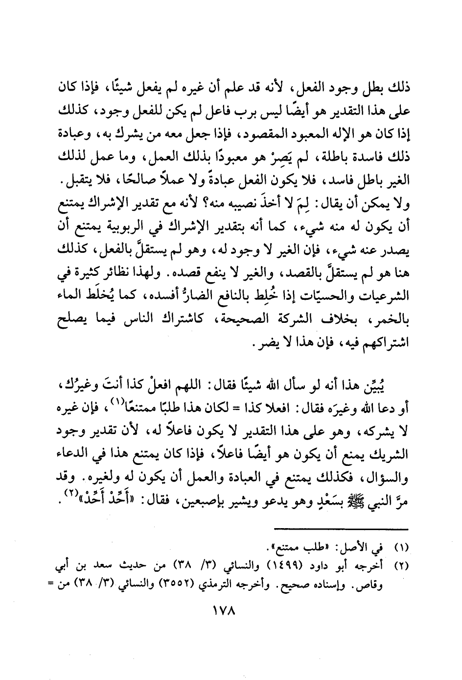 يُبيِّن هذا أنه لو سأل الله شيئًا فقال: اللهم افعلْ كذا أنتَ وغيرُك، أو دعا الله وغيرَه فقال: افعلا كذا= لكان هذا طلبًا ممتنعًا (1)، فإن غيره لا يشركه، وهو على هذا التقدير لا يكون فاعلاً له، لأن تقدير وجود الشريك يمنع أن يكون هو أيضًا فاعلاً، فإذا كان يمتنع هذا في الدعاء والسؤال، فكذلك يمتنع في العبادة والعمل أن يكون له ولغيره. وقد مرَّ النبي - صَلَّى اللَّهُ عَلَيْهِ وَسَلَّمَ - بسَعْدٍ وهو يدعو ويشير بإصبعين، فقال: "أَحِّدْ أَحِّدْ" (2).