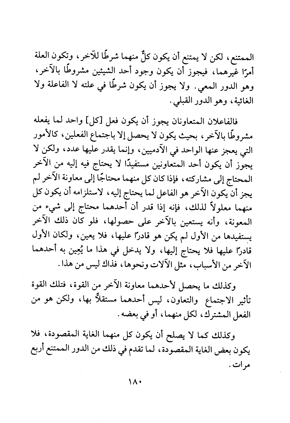 فالفاعلان المتعاونان يجوز أن يكون فعل أكل، واحد لما يفعله مشروطًا بالاَخر، بحيث يكون لا يحصل إلا باجتماع الفعلين، كالأمور التي يعجز عنها الواحد في الاَدميين، وإنما يقدر عليها عدد، ولكن لا يجوز أن يكون أحد المتعاونين مستفيدًا لا يحتاج فيه إليه من الآخر المحتاج إلى مشاركته، فإذا كان كل منهما محتاجًا إلى معاونة الآخر لم يجز أن يكون الآخر هو الفاعل لما يحتاج إليه، لاستلزامه أن يكون كل منهما معلولاً لذلك، فإنه إذا قدر أن أحدهما محتاج إلى شيء من المعونة، وأنه يستعين بالاَخر على حصولها، فلو كان ذلك الآخر يستفيدها من الأول لم يكن هو قادرًا عليها، فلا يعين، ولكان الأول قادرًا عليها فلا يحتاج إليها، ولا يدخل في هذا ما يُعِين به أحدهما الآخر من الأسباب، مثل الاَلات ونحوها، فذاك ليس من هذا.