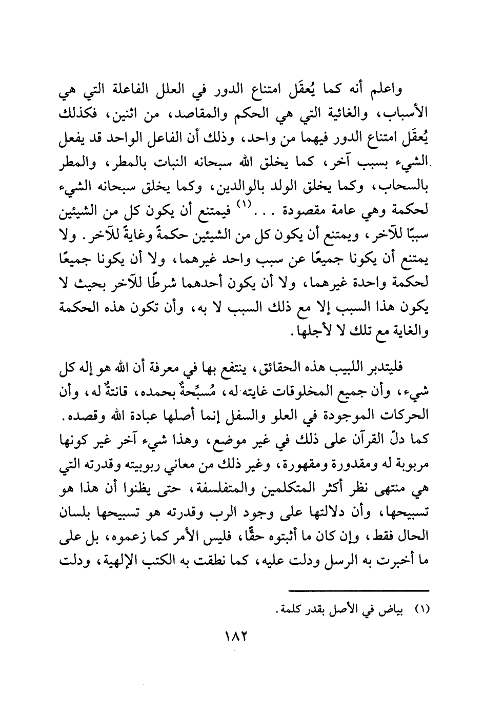 واعلم أنه كما يُعقَل امتناع الدور في العلل الفاعلة التي هي الأسباب، والغائية التي هي الحكم والمقاصد، من اثنين، فكذلك يُعقَل امتناع الدور فيهما من واحد، وذلك أن الفاعل الواحد قد يفعل. الشيء بسبب آخر، كما يخلق الله سبحانه النبات بالمطر، والمطر بالسحاب، وكما يخلق الولد بالوالدين، وكما يخلق سبحانه الشيء لحكمة وهي عامة مقصودة ... (1) فيمتنع أن يكون كل من الشيئين سببًا للَاخر، ويمتنع أن يكون كل من الشيئين حكمةً وغايةً للَاخر. ولا يمتنع أن يكونا جميعًا عن سبب واحد غيرهما، ولا أن يكونا جميعًا لحكمة واحدة غيرهما، ولا أن يكون أحدهما شرطًا للَاخر بحيث لا يكون هذا السبب إلا مع ذلك السبب لا به، وأن تكون هذه الحكمة والغاية مع تلك لا لأجلها.